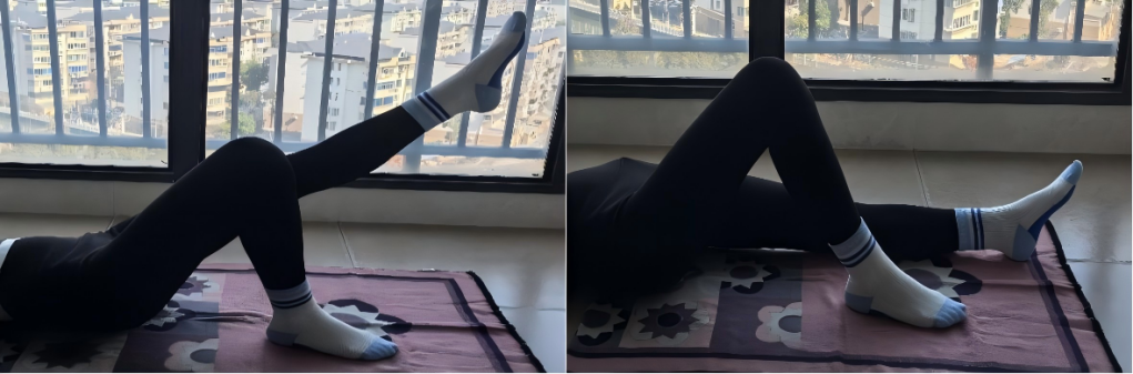 直腿抬高:取仰卧位,一侧下肢伸直,另一侧弯曲。缓慢抬起伸直的下肢,维持5 s后放下。重复10~15次,双腿交替进行。