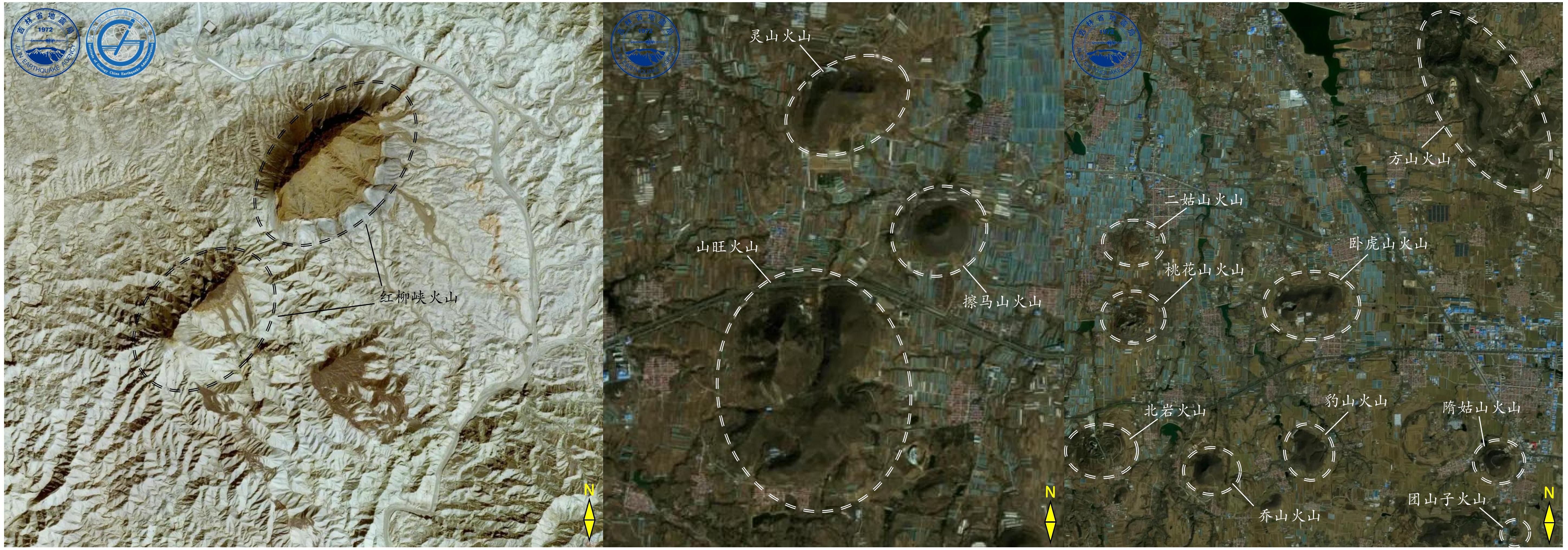 甘肃省玉门市红柳峡火山(左图)和山东省潍坊市临朐县地区(中图)与昌乐县地区(右图)部分火山对地观测影像图(图源于GF–2与JL1GP02对地观测影像)
