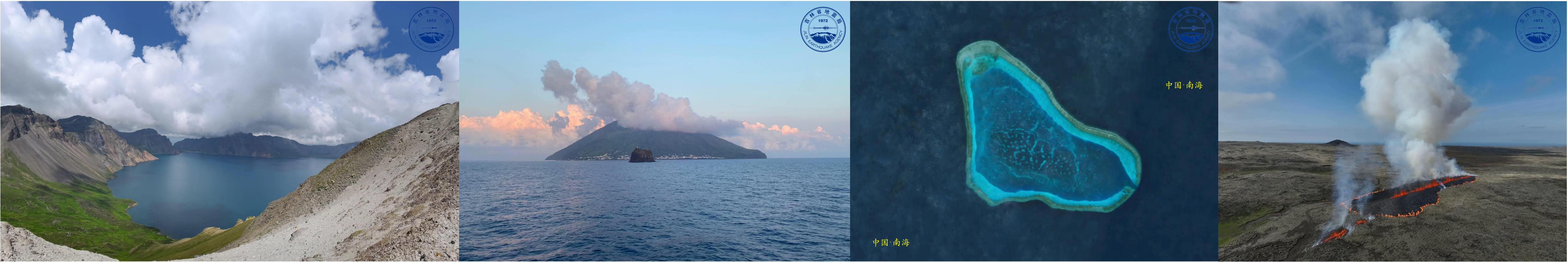 中国长白山天池活火山(左一)、意大利斯通博利活火山(左二)、中国黄岩岛(又名民主礁)(右二)和冰岛雷恰角半岛活火山(右一)(均为原创图件)