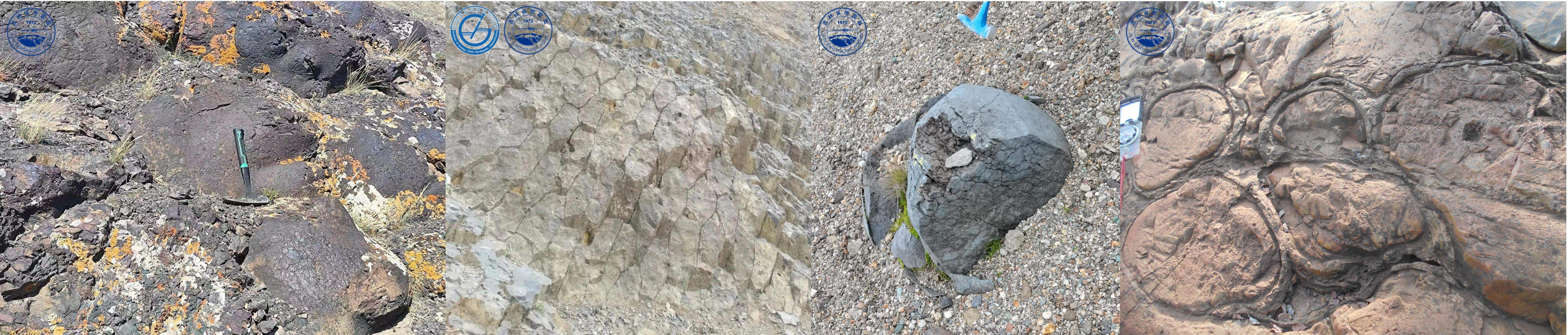 中国甘肃省枕状玄武质熔岩(左一)、中国山东省北岩山火山柱状玄武岩(左二)、中国吉林省长白山天池火山近圆状粗面岩火山角砾(右二)和塞内加尔卢加省枕状玄武岩(右一)(均为原创图件)