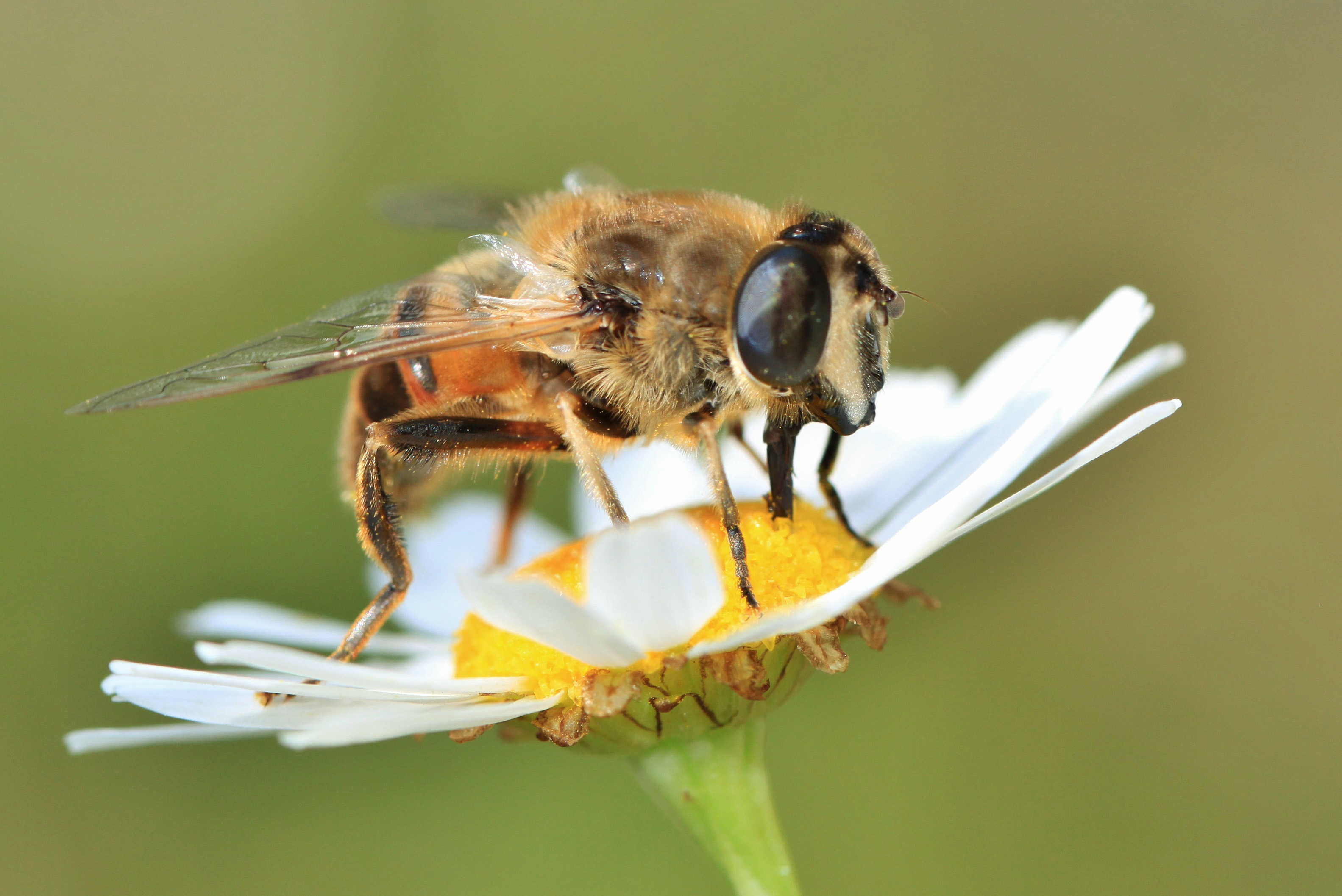 蜜蜂身体呈黄褐色至黑褐色,密布绒毛,便于黏附花粉。身体分头、胸、腹三部分,头部有一对复眼和三个单眼,触角呈膝状,用于感知气味。其最著名的“武器”是腹末端的螫针,呈倒钩状,连接着毒囊。
