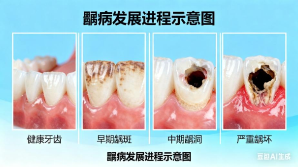 1. 初期:牙齿表面(尤其是窝沟、邻面)出现白色或黄褐色斑点,质地略粗糙,无明显疼痛。此时牙釉质仅发生脱矿,若及时干预可逆转。