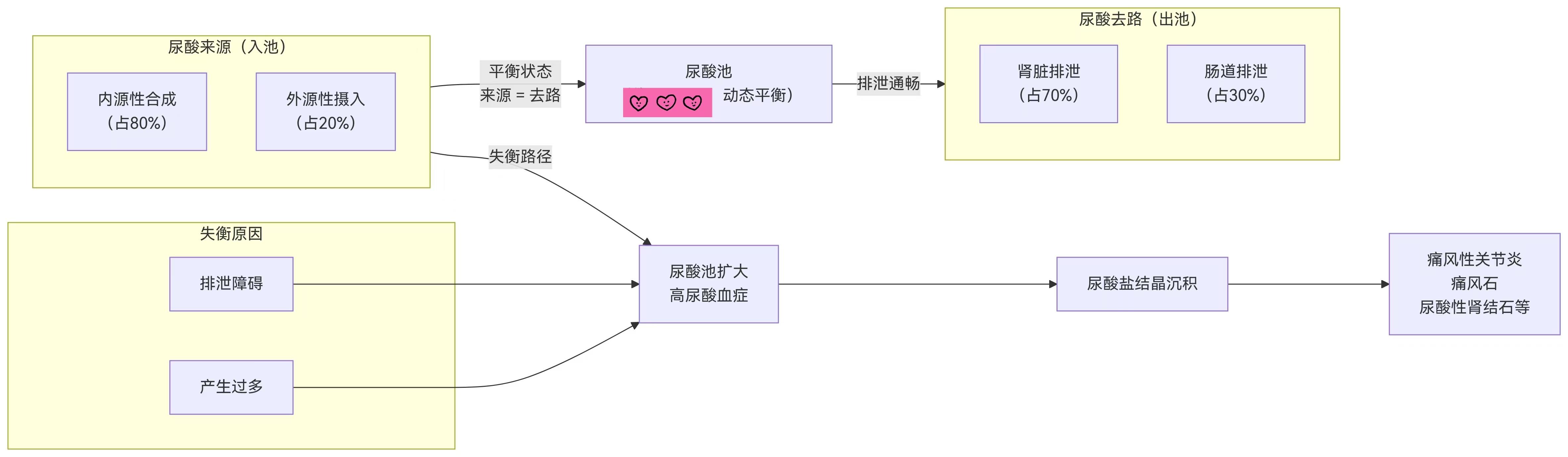 当“进水”太多(来源过多)或“出水”不畅(排泄减少),血液中的尿酸浓度就会超标,这就形成了高尿酸血症。
