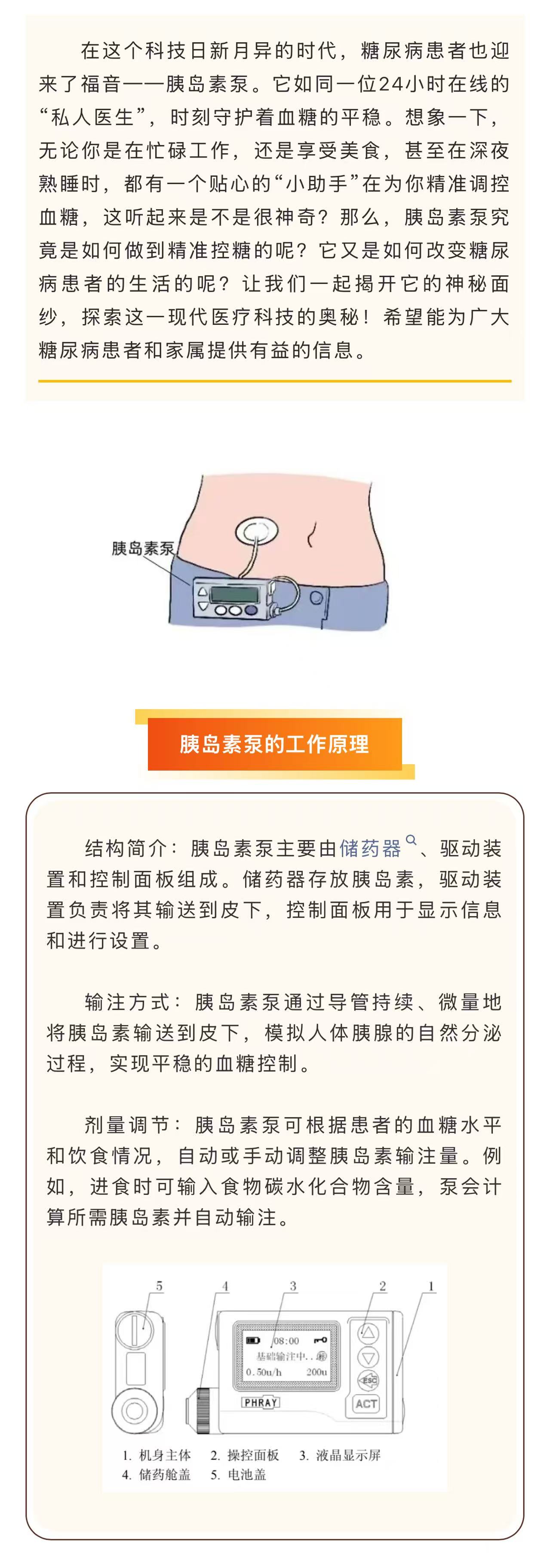 图文简介: 在这个科技日新月异的时代,糖尿病患者也迎来了福音——胰岛素泵。它如同一位24小时在线的“私人医生”,时刻守护着血糖的平稳。让我们一起揭开它的神秘面纱,探索这一现代医疗科技的奥秘!