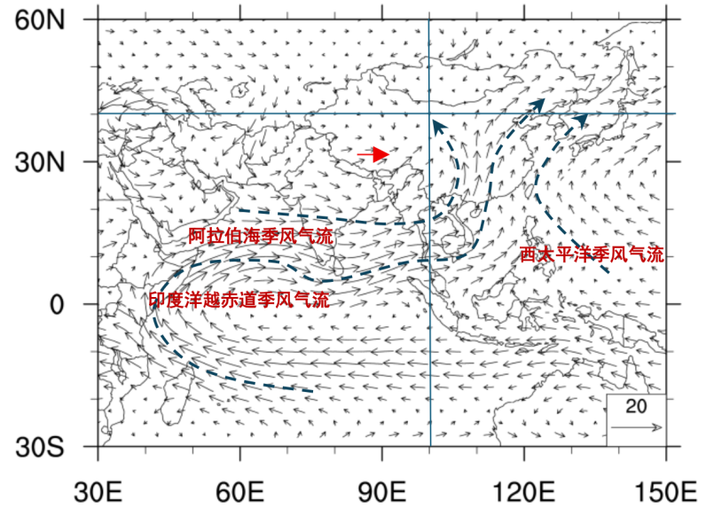 在强季风年夏季,850 百帕气流图显示,到达中国的三支季风气流包括来自阿拉伯海和孟加拉湾的季风气流、印度洋越赤道季风气流及热带西太平洋季风气流 [1]。它们携带大量水汽,分别输送至西部的青藏高原、中国中部及东部广大地区。其中,西部季风(高原季风)气流遇到高原高山时被迫抬升,水汽冷却凝结形成降水,滋养高原南坡,为雅鲁藏布江等河流提供重要水源。正在建设中的雅鲁藏布江下游水电工程就在季风上坡气流中(图中红箭头)。印度洋越赤道季风气流还能将水汽输送至中国东部和北部地区,带来北方降水。热带西太平洋季风气流则通过台风和东风波,为华南、华中、华东、华北及东北地区送去雨水。