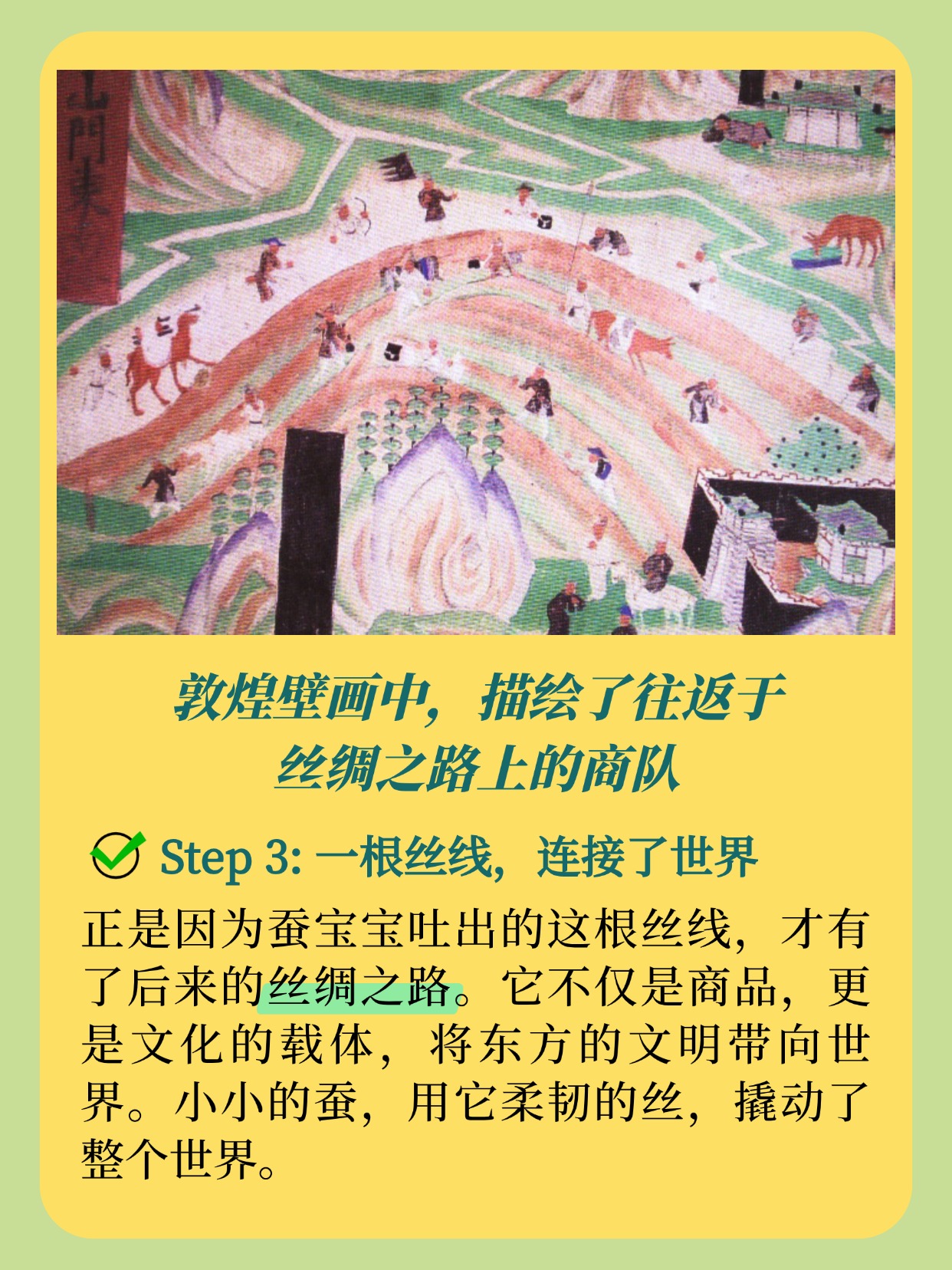 · 没有蚕丝,就没有“丝绸之路”。一根纤细的丝线,撬动了整个世界的贸易与文化交流,把东方文明带到全球。小小的蚕,撑起了世界史的舞台!