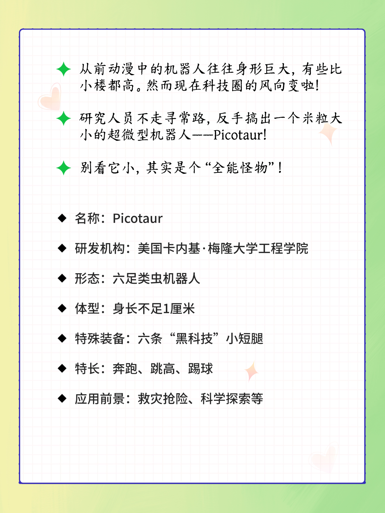 卡内基·梅隆大学工程学院的研究人员不走寻常路,不造“大家伙”,反手搞出了一个米粒那么大的超微型机器人——Picotaur!别看它小,其实是个“全能怪物”!