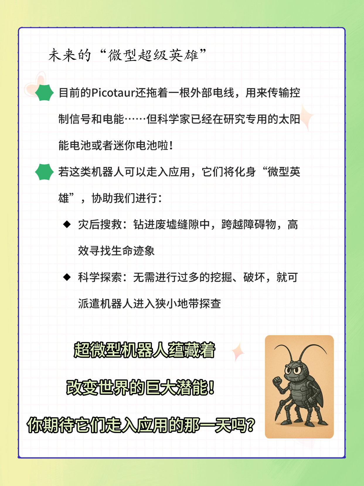 当然啦,目前的Picotaur还拖着一根小“尾巴”(外部电线,用来控制与供能),像老式的有轨电车……但科学家已经在研究给它装上太阳能电池或者迷你电池啦!