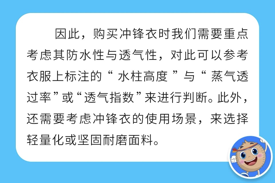 购买冲锋衣时我们需要重点考虑其防水性与透气性,对此可以参考衣服上标注的“水柱高度”与“蒸气透过率”或“透气指数”来进行判断。此外,还需要考虑冲锋衣的使用场景,来选择轻量化或坚固耐磨面料。