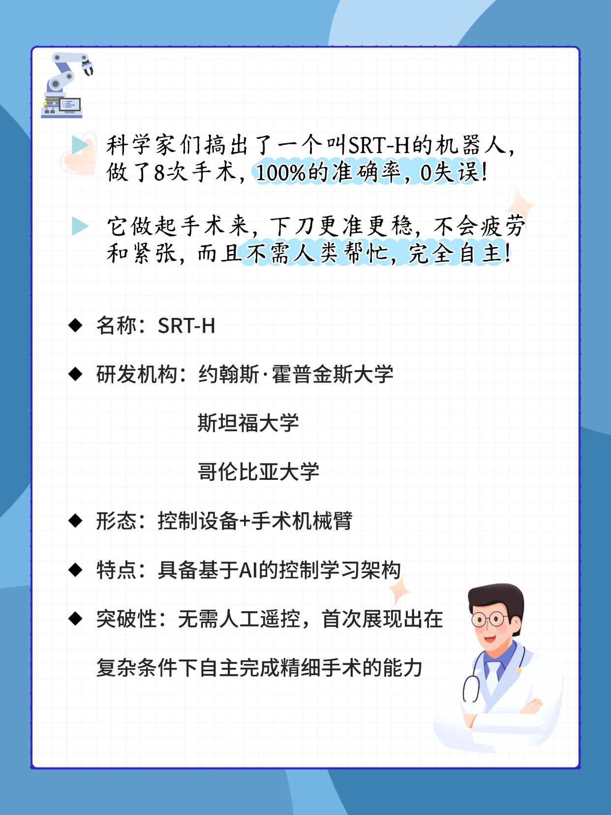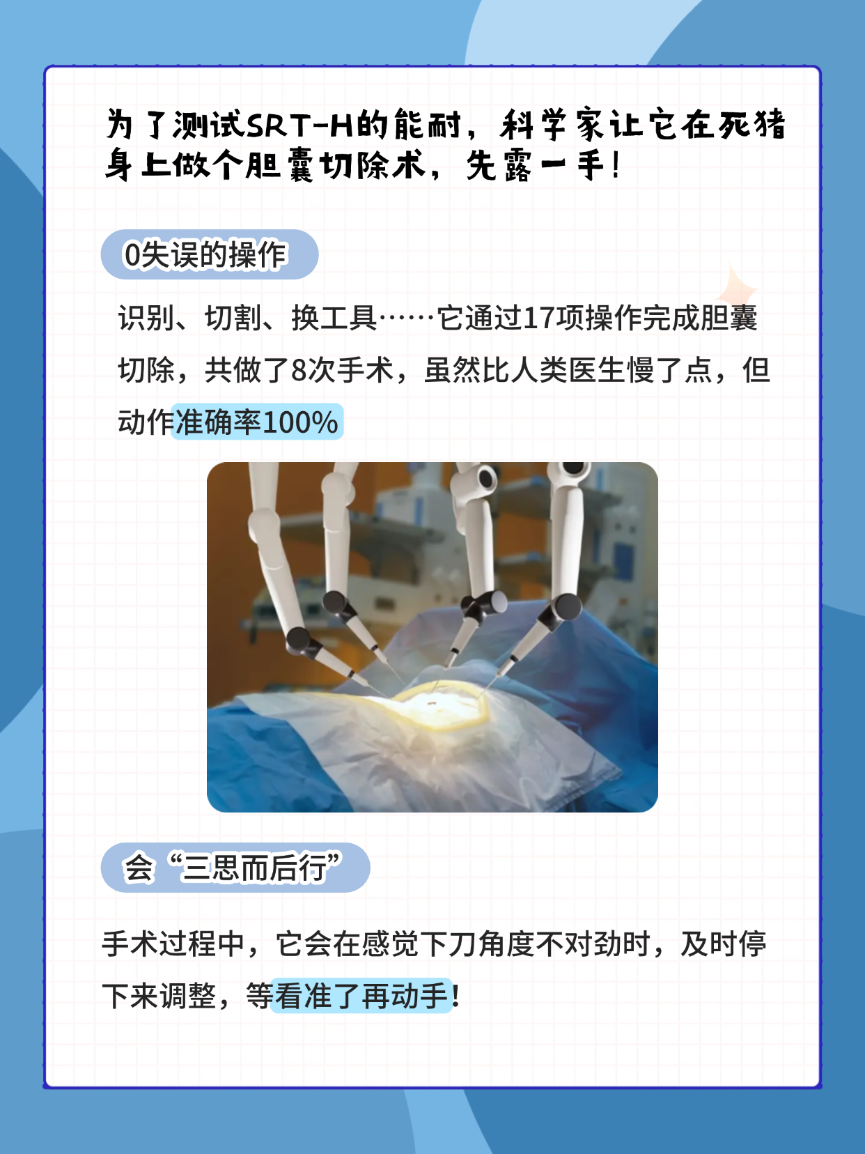 科学家们搞出了一个叫SRT-H的机器人,做了8次手术,操作达到100%的准确率,0失误!