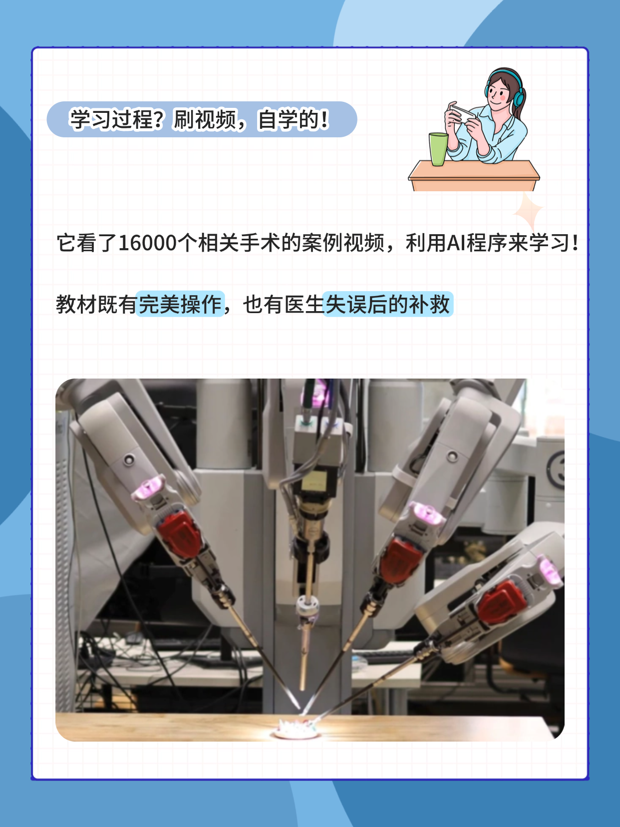 SRT-H利用AI学习程序,看了16000个相关手术的案例视频,教材涵盖完美操作和失误后的紧急补救。