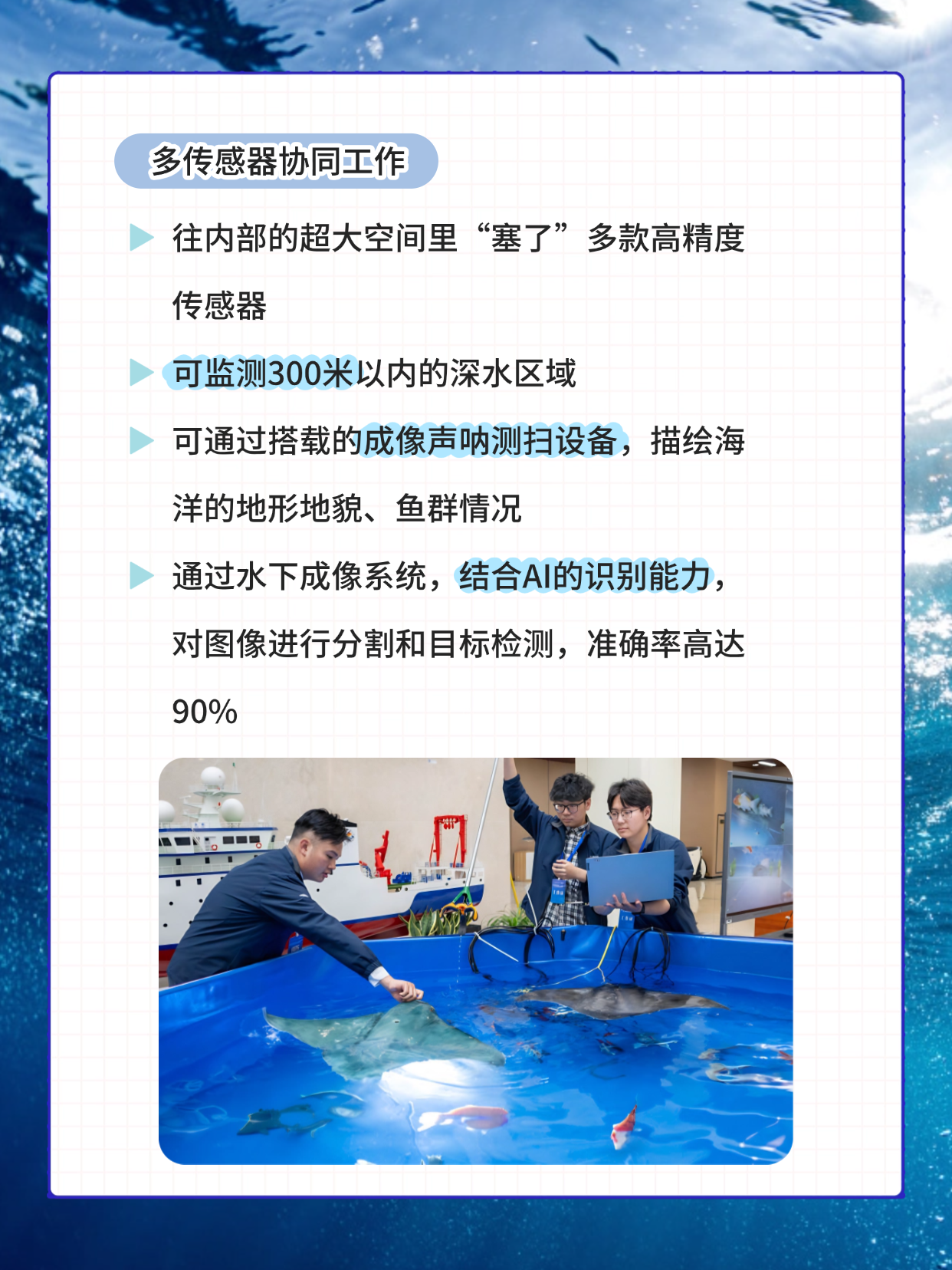 这些设备给予了机器仿生鱼强大的探测能力,它们既能描绘海洋的地形地貌,也能跟踪、监视鱼群情况!它的监测距离可达水下300米!