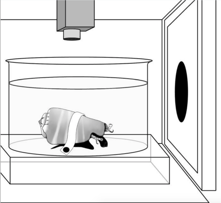 红娇凤凰螺被绑在实验水缸底部, 被“逼着”看前面的圆形图像。然后通过黑色的圆圈的变化(比如不断扩大),看红娇凤凰螺会不会出现缩眼睛躲避之类的反应。