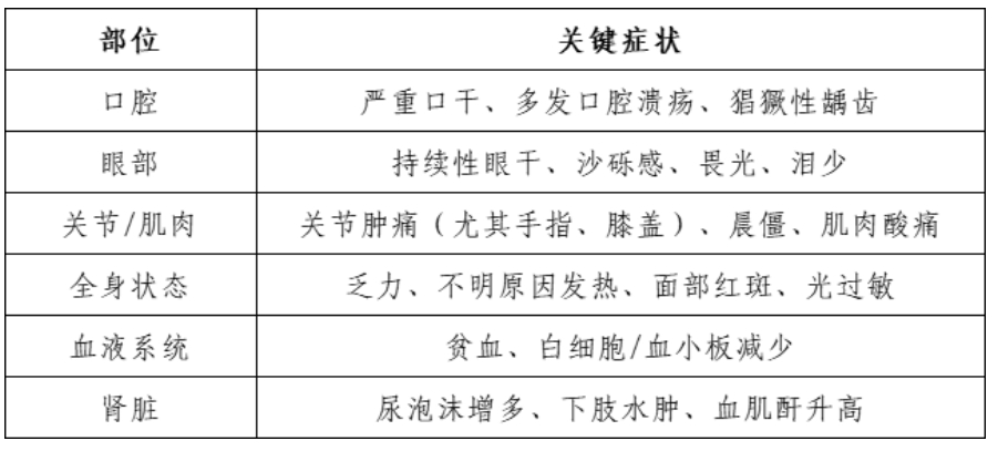 出现2种及以上相关症状,特别是“口腔问题+眼干/关节痛/肾损伤”组合,应及时就诊风湿免疫科。风湿免疫病可累及多器官系统,及时诊断与规范治疗对阻止不可逆损伤至关重要。