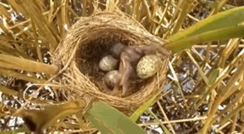 杜鹃雏鸟正将宿主鸟蛋推出巢 图片来源:YouTube