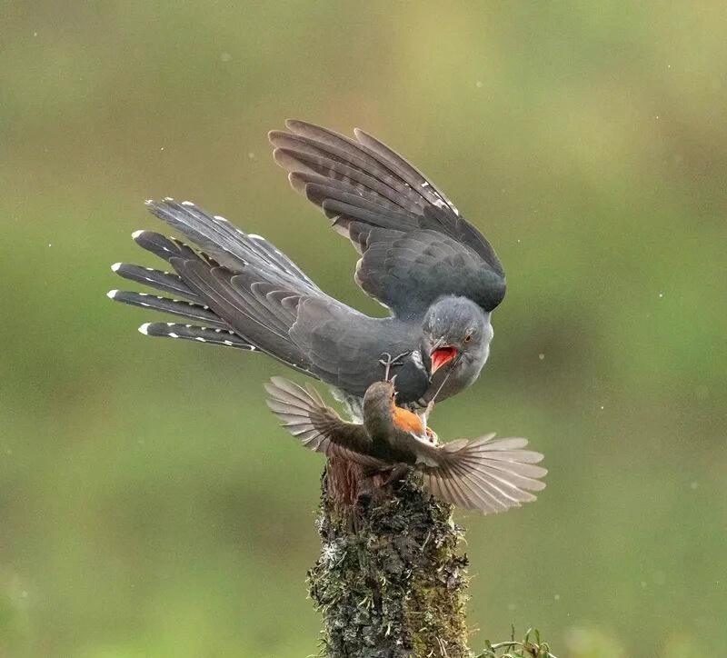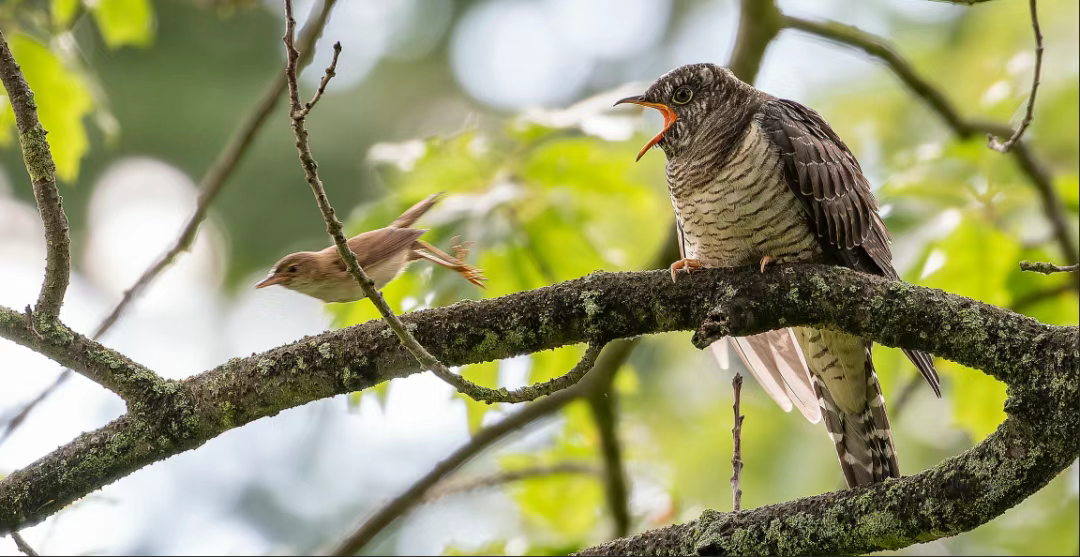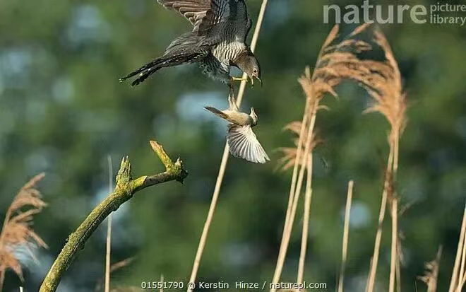 湿地苇莺(A. palustris)正与大杜鹃打斗。图片来源:Kerstin Hinze / naturepl.com