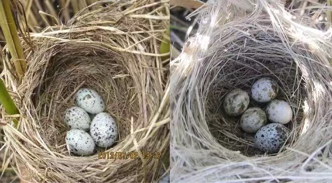 被大杜鹃巢寄生的东方大苇莺(左)和震旦鸦雀(右)的巢。 图片来源:Canchao YANG,et al. / Zoological Research(2014)