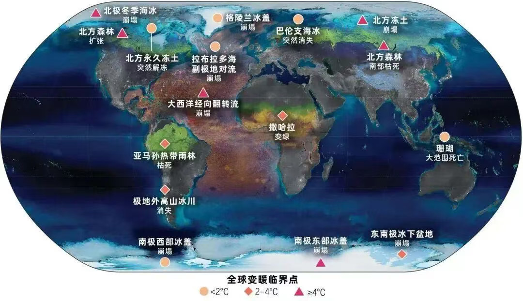 这个概念是联合国IPCC提出的,说白了就是地球气候系统的“生死门槛”——它是个从低到高的范围,一旦踩进低端,生物圈、冰雪圈这些系统发生“大突变”的风险会飙升;要是摸到高端,气候系统就会像倒了的多米诺骨牌,一路滑向全新状态,哪怕后来温度降了,也回不到从前了。