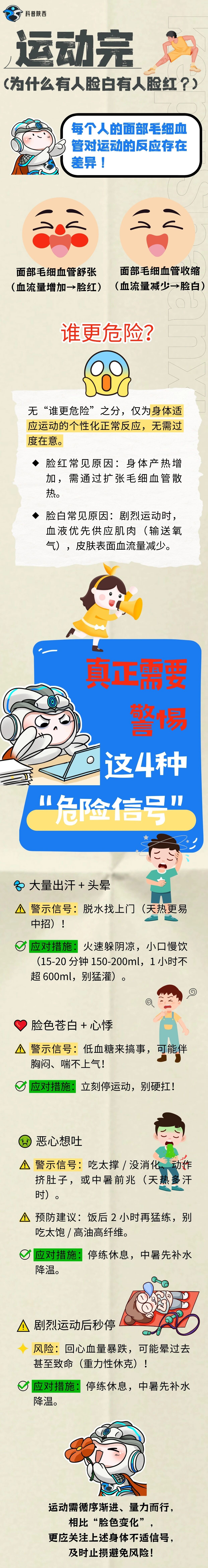 图文简介: 运动后脸红脸白均正常,无需纠结!真正要警惕的是脱水、低血糖等4类危险信号。读懂身体求救暗号,科学运动才靠谱,快转给运动搭子~