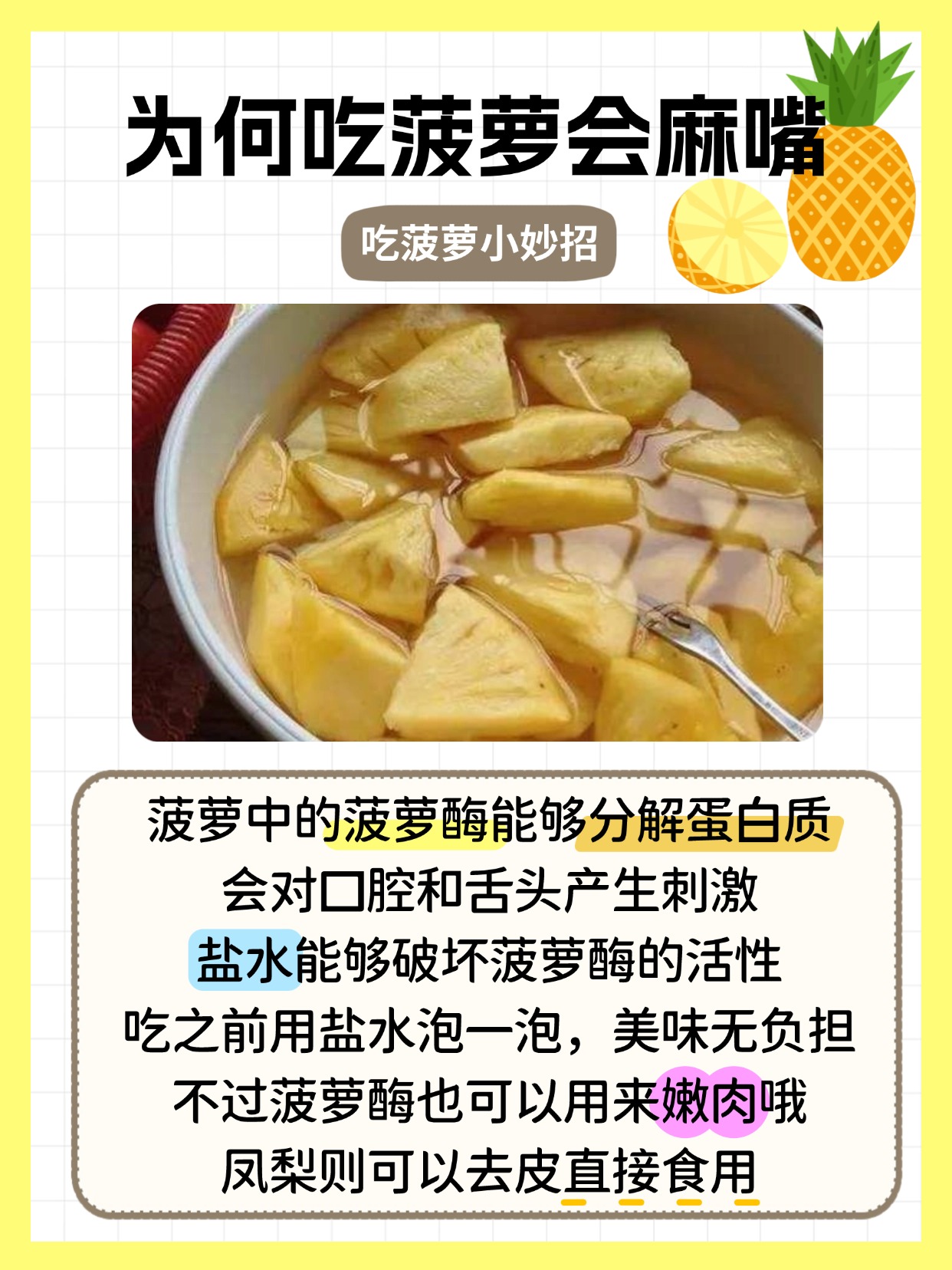 为啥吃菠萝会麻嘴呢?这背后的“罪魁祸首”就是菠萝蛋白酶。这种酶会分解我们口腔黏膜中的蛋白质,刺激口腔黏膜和舌头,让我们产生麻、涩的感觉。而且菠萝里还含有草酸钙晶体,这种晶体也会刺激口腔,加重麻嘴的症状。