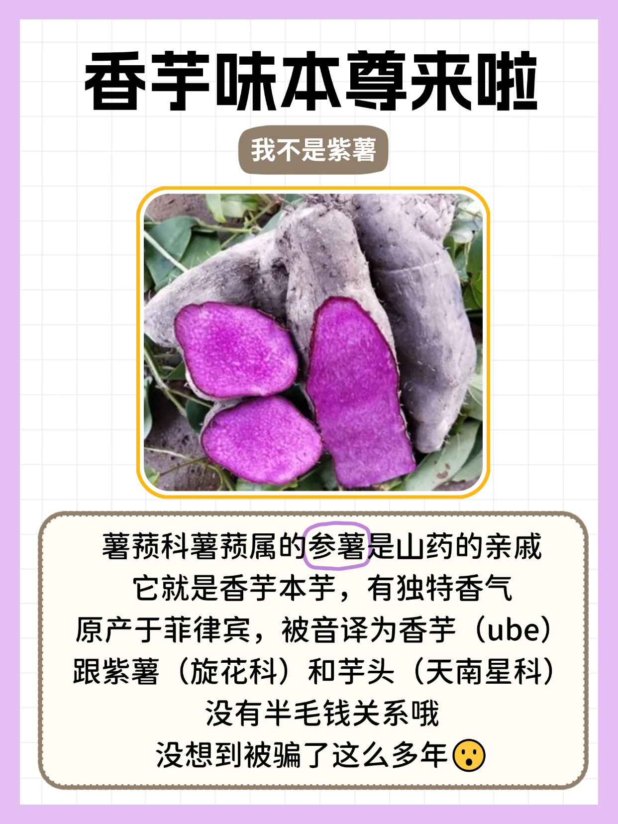 🍦还记得童年最爱的香芋冰激凌吗?明明芋头是白胖子,怎么冻成冰淇淋就变紫色了?今天必须给宝子们扒清楚——香芋不是芋头!不是紫薯!也不是魔芋!它是薯蓣科薯蓣属的「参薯」,和山药才是同科同属的"真·亲戚"!