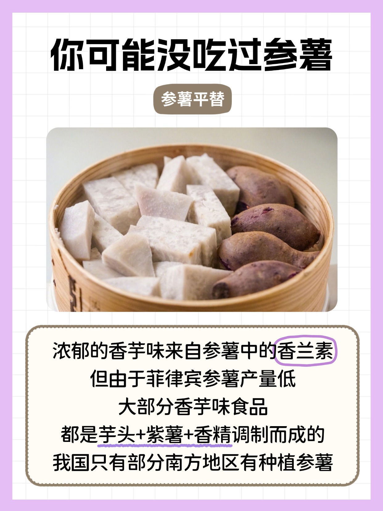• 正宗参薯果肉自带紫罗兰色,自带清甜香草味,粉糯程度吊打普通红薯!菲律宾人最爱用它加炼乳/椰奶做甜品,但近年产量下降+进口成本高,很多"香芋味"其实是用普通芋头+紫薯+香精调出来的(廉价版甚至只有香精!)