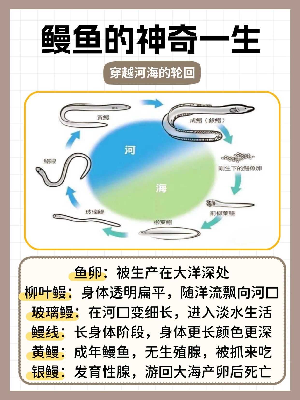 深海产卵→柳叶鳗(透明扁平)→玻璃鳗(河口变身)→黄鳗(淡水长大)→银鳗(洄游产卵死亡)