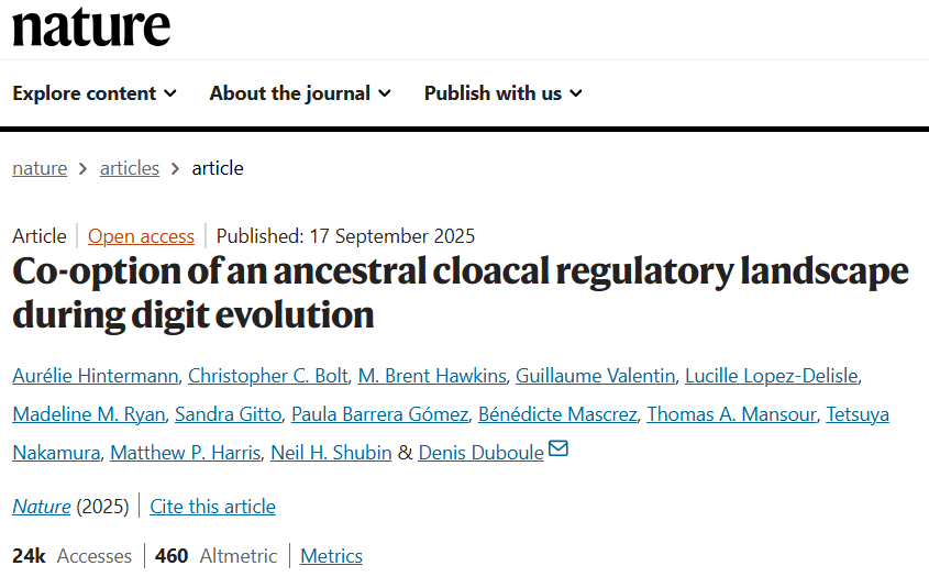 [1] Hintermann, Aurélie, et al. "Co-option of an ancestral cloacal regulatory landscape during digit evolution." Nature (2025): doi: 10.1038/s41586-025-09548-0.