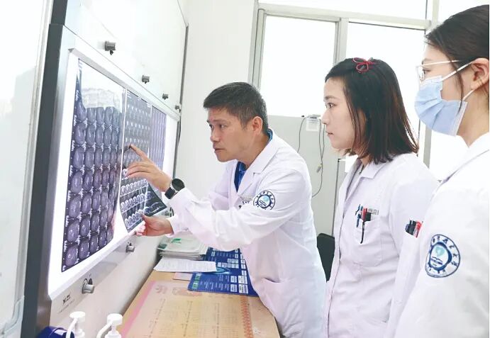 陈竹(左一)与团队成员讨论患者病情。受访者供图
