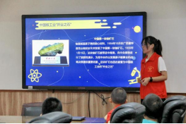 活动伊始,蔚蓝小菜花科普团以“闪闪发光的‘星星’故事”切入,开启“两弹一星”精神宣讲课堂。结合PPT,志愿者用孩童易懂的语言,从“戈壁滩上的无名英雄”讲到“党旗引领的核能征程”,还原关键历史节点:1954年中国首块铀矿石成为核工业“开业之石”,1964年罗布泊升起原子弹蘑菇云,1967年第一颗氢弹空爆试验成功。