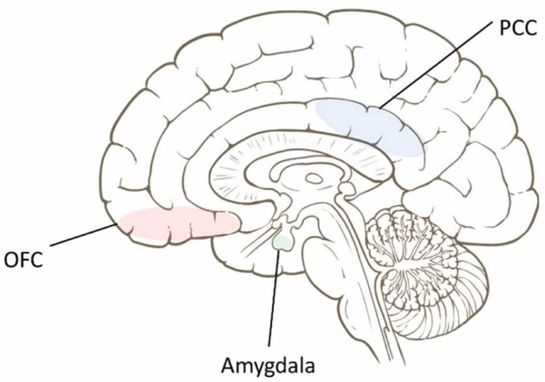人脑示意图 OFC:眶额皮层,PCC:后扣带皮层(图片来源:参考文献2)