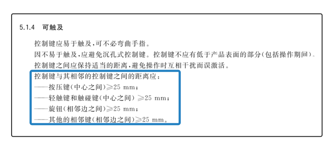 《GB/T老年人36947-2018面向老年人的家用电器用户界面设计规范》中对适老化电器产品控制键之间的距离有相应的规定。