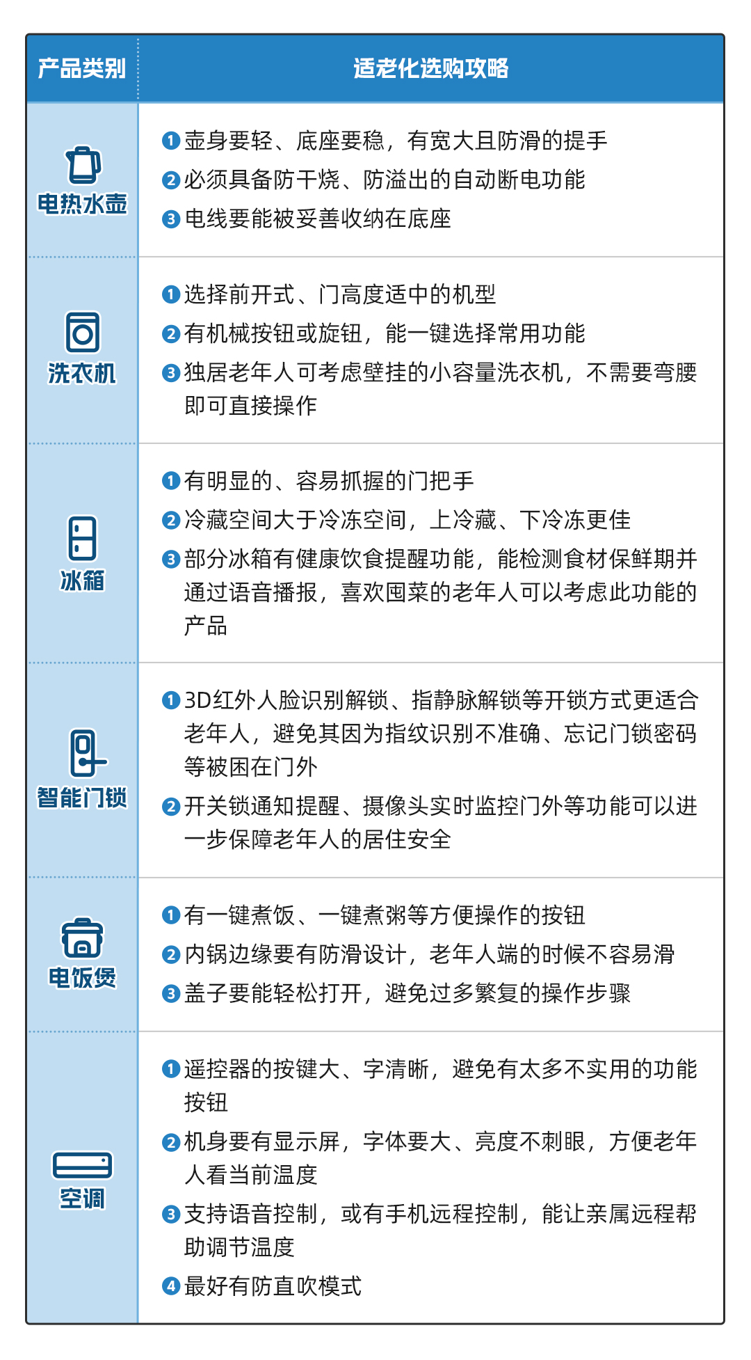 给老年人选家电,切忌操之过急、盲目跟风,但也不要一刀切地拒绝智能和高科技,关键还是找到加减之间的平衡点:该简化的绝不复杂,该智能的就精准实用,让孝心真正适配老年人的生活。