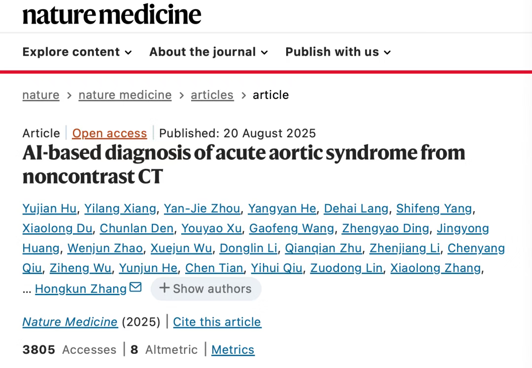 8月底,浙江大学医学院附属第一医院与湖畔实验室(阿里巴巴达摩院)联合发布了一款应用于胸痛急诊的AI诊断模型——iAorta。该模型能够基于常规平扫CT,在数秒内智能识别急性主动脉综合征,将确诊时间缩短至2小时以内。截至8月,iAorta已成功在超过1万名胸痛患者中精准筛查出21例该疾病患者,为患者争取了宝贵的救治时间。