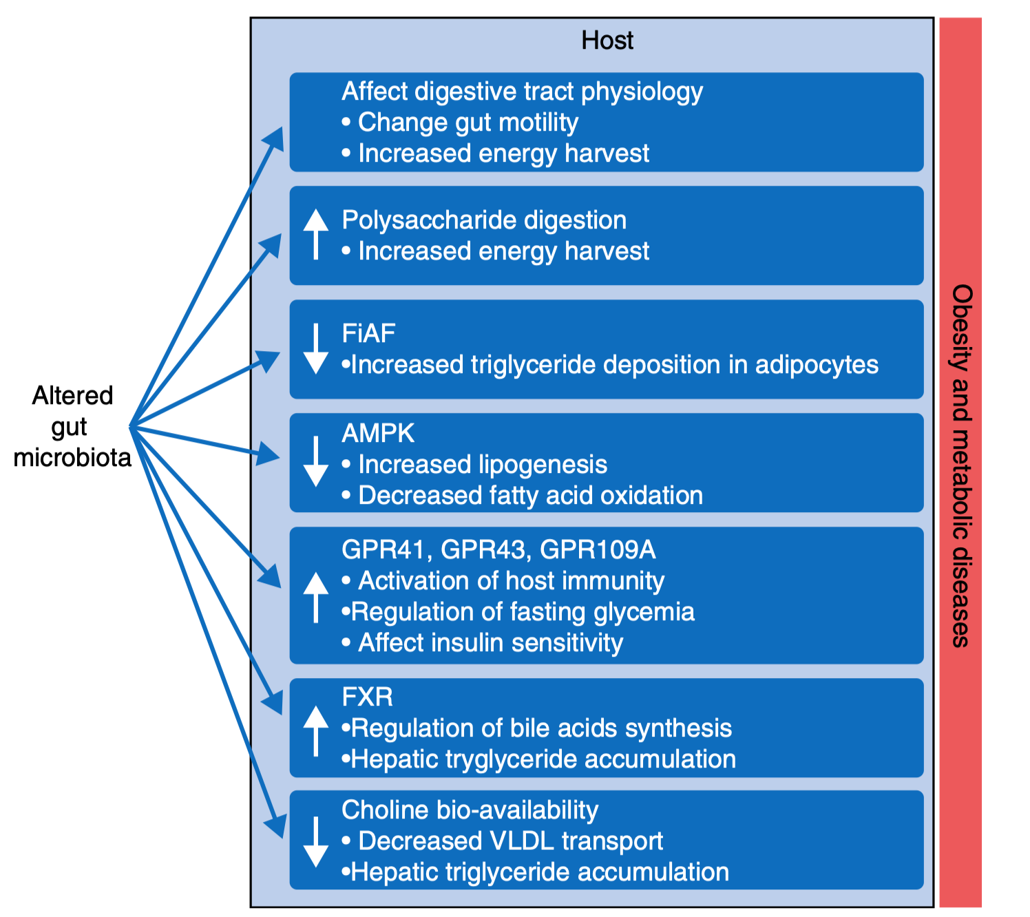 图2 | 当肠道菌群失衡时,它会通过多种信号通路改变人体的能量利用方式、脂肪代谢和炎症水平,从而推动肥胖和代谢紊乱的发生