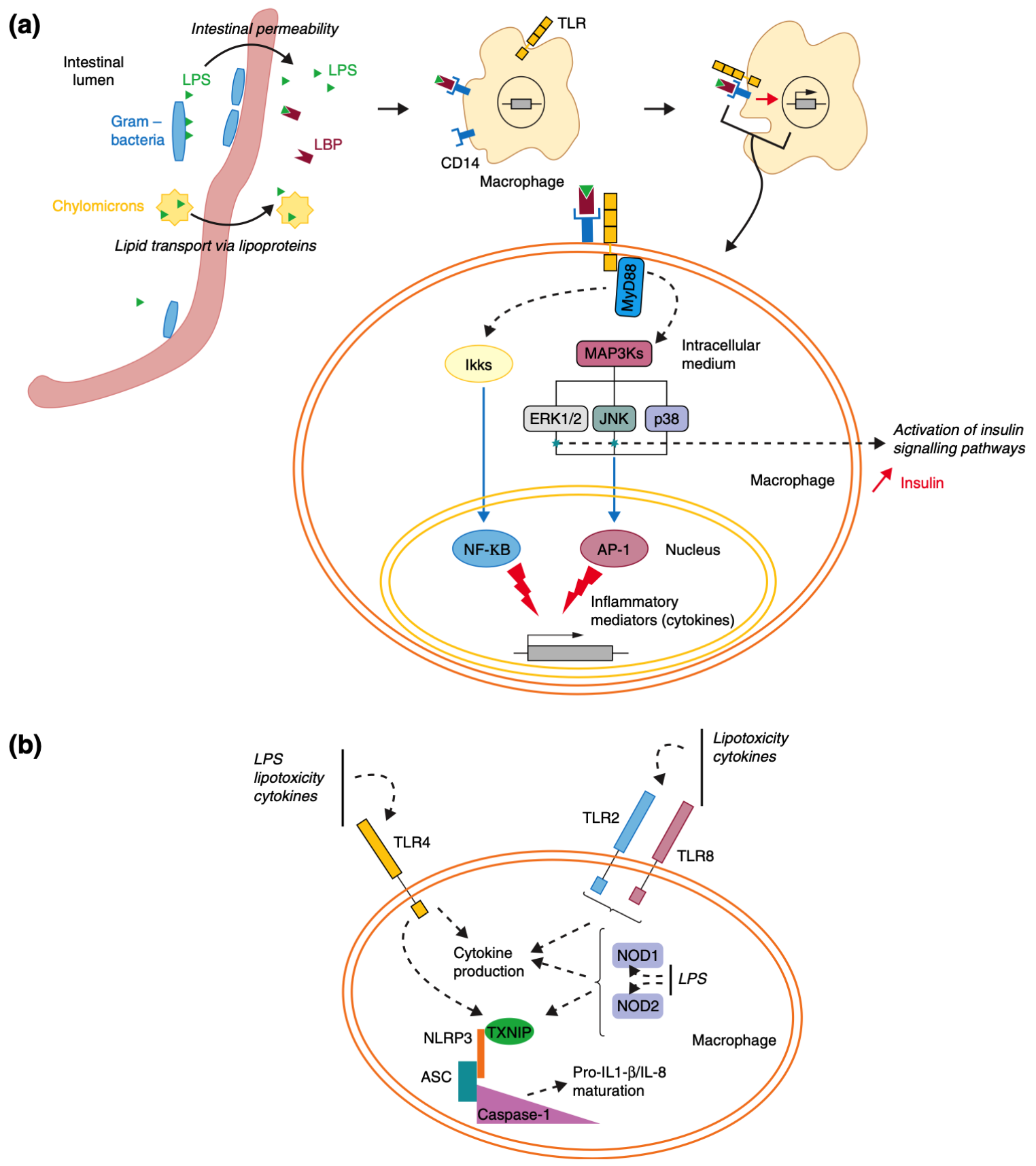 当肠道菌群失衡导致细菌成分(如LPS)进入体内后,会激活免疫受体(TLR、NOD),触发炎症信号(NF-κB、MAPK等),并干扰胰岛素信号传导,最终导致慢性炎症和胰岛素抵抗