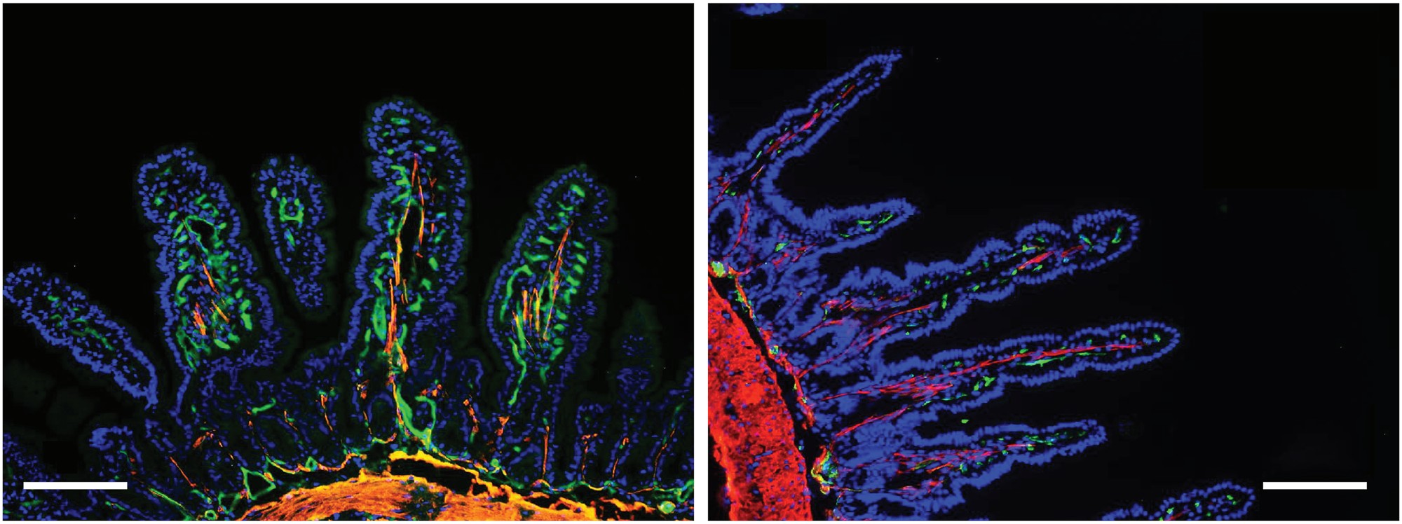 图1|有菌小鼠(左) vs 无菌小鼠(右):肠道微生物让血管“更密集”