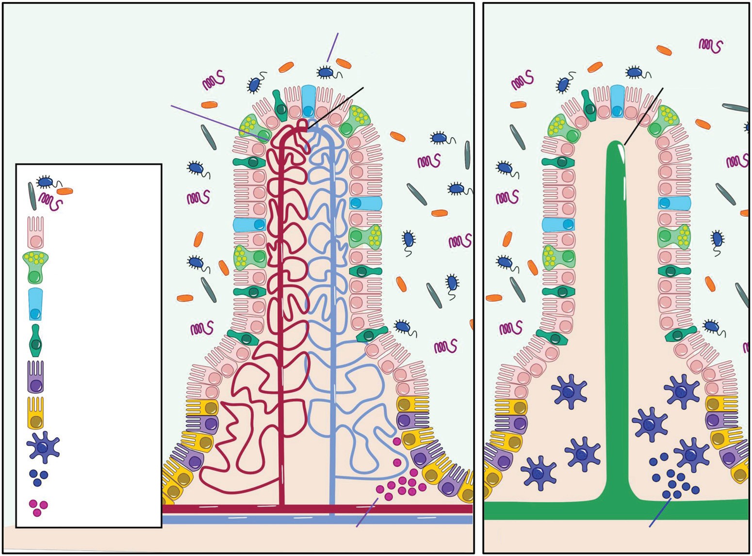 肠道绒毛(像一根根手指)内部充满毛细血管。肠道菌群释放信号分子,激活免疫细胞(如先天免疫受体TLR),促进血管新生。结果毛细血管网络增密,吸收面积扩大,代谢物运输更高效。