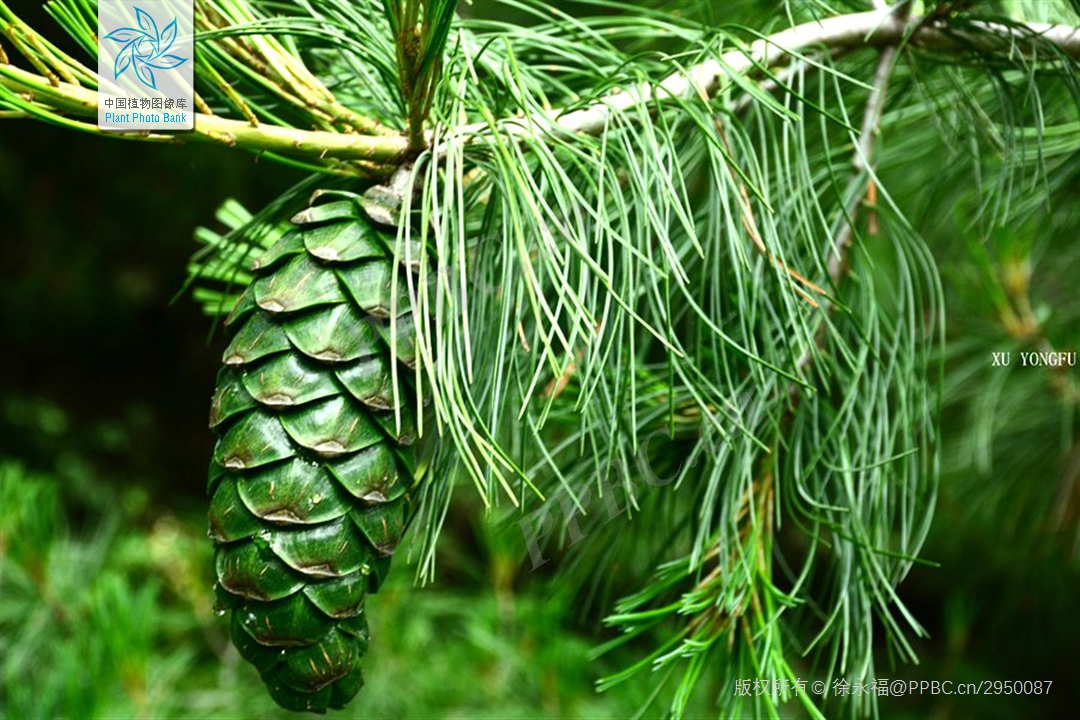 华山松的幼树树皮为灰绿色或淡灰色,平滑,老则呈灰色,裂成厚块片固着于树干上,或脱落;枝条平展,一年生枝绿色或灰绿色,干后褐色,冬芽近圆柱形,褐色;针叶边缘具细锯齿,横切面三角形;球果圆锥状长卵圆形,幼时绿色,成熟时黄色或褐黄色;花期4~5月,球果第二年9~10月成熟。