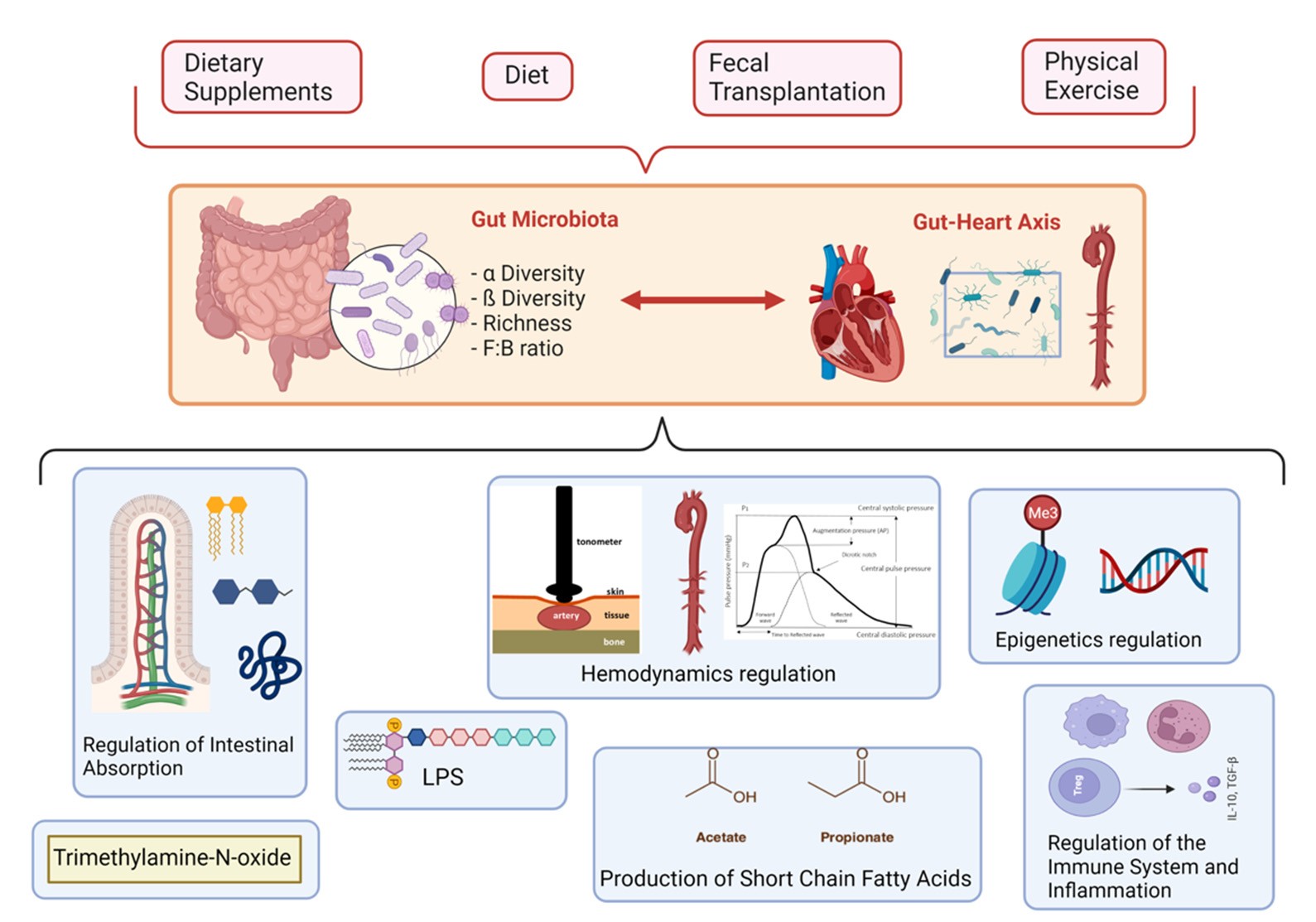 研究首先明确了一个新概念——血管老化(vascular aging, VA)。它是心血管疾病的早期阶段,标志是动脉壁僵硬、脉搏波速度(PWV)升高。肠道菌群与这种变化高度相关。年轻健康人群中,Faecalibacterium prausnitzii、Akkermansia muciniphila、Bifidobacterium 等益生菌丰富,能产生短链脂肪酸(SCFAs)如丁酸和丙酸,具有抗炎与扩张血管的作用。而在老化或患有高血压、糖尿病的群体中,产毒菌如 Clostridium、Desulfovibrio、Enterobacteriaceae 却占据主导地位,促进炎症和氧化应激。