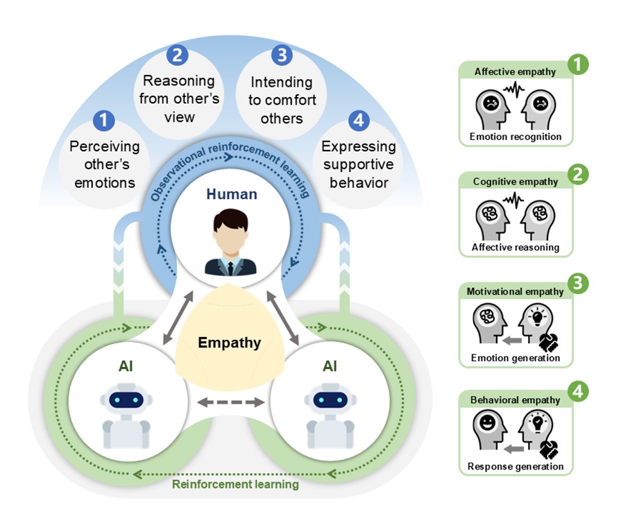 为了达成以上目标,人类对AI的共情倾向,以及AI对人类的情绪识别能力、共情行为表达能力,都需要进一步加强。基于“观察强化学习”(observational reinforcement learning)的思路,文章认为人类可以通过观察他人对AI的共情行为,增强自身对AI的共情倾向;同样道理,若将观察学习机制融入AI的共情学习,AI也将能够从人类真实的互动模式中习得更自然的共情反应,而不仅是依赖预设程序的模拟。