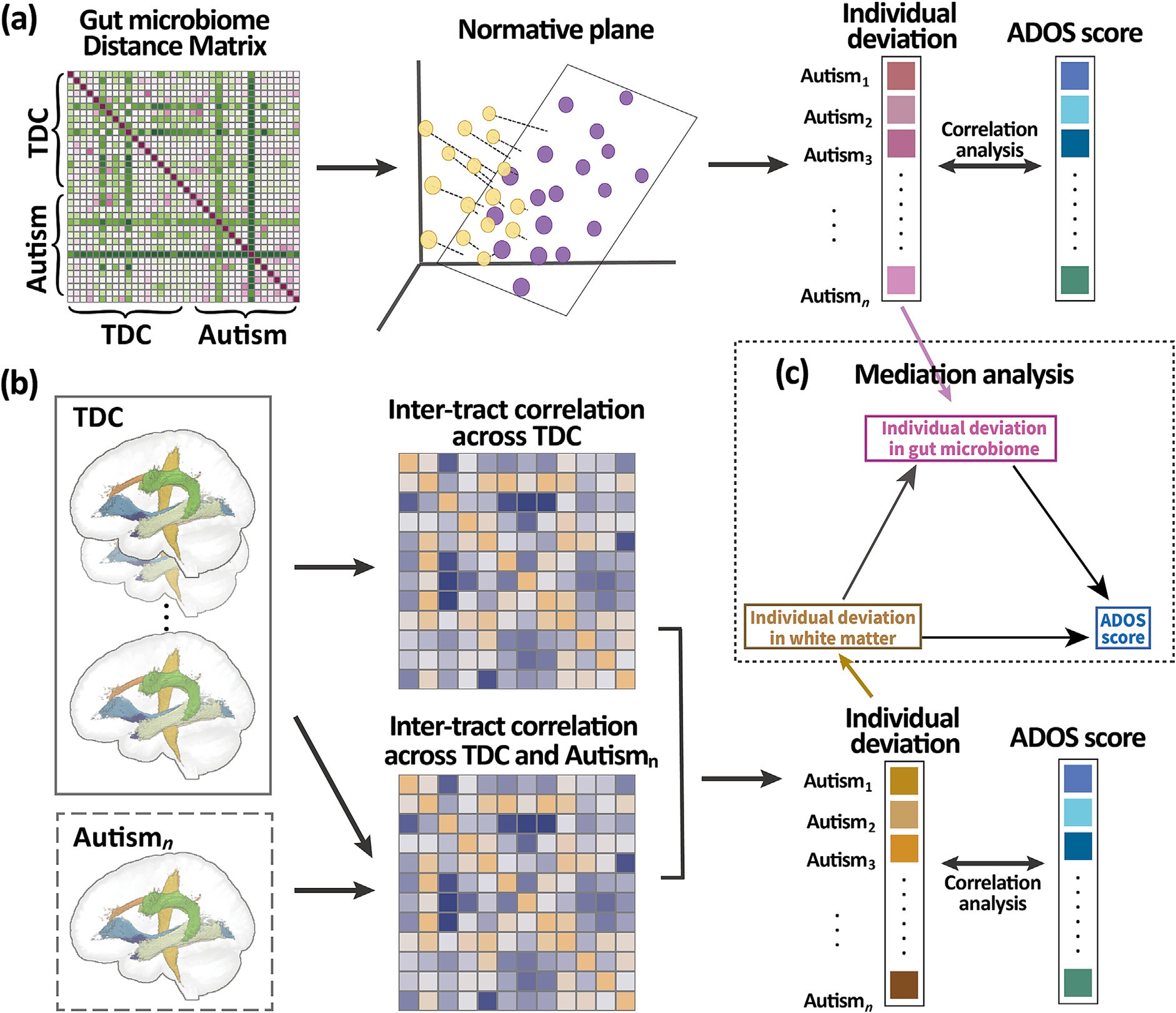 研究团队收集了 112 名 3–7 岁自闭症儿童的粪便样本与磁共振扩散张量成像(DTI)数据,用以刻画个体肠道菌群组成与大脑白质微结构的“偏离度”。所谓偏离度,指的是相较于同龄典型发育儿童的差异强度——偏离越大,意味着该系统的发育轨迹越异常。