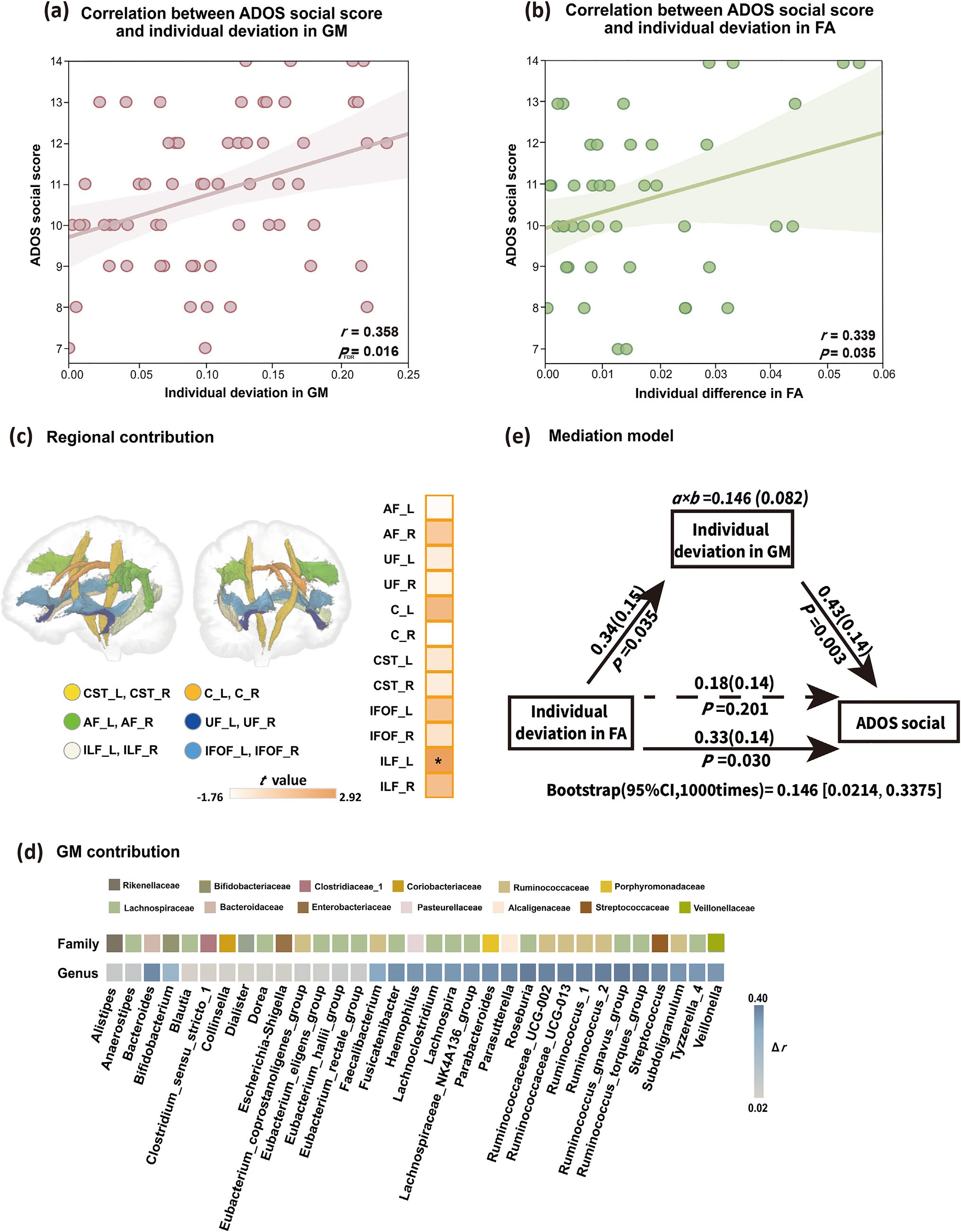 图2|肠道菌群偏离与白质微结构偏离均与社交得分显著相关,肠道菌群在二者关系中起中介作用。