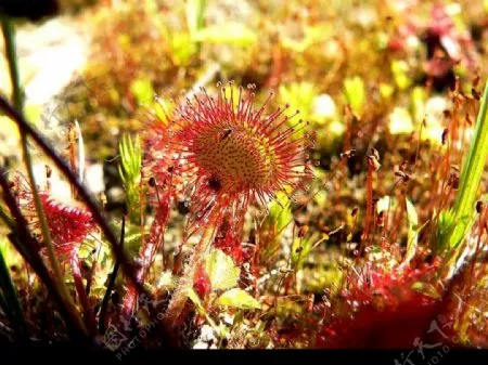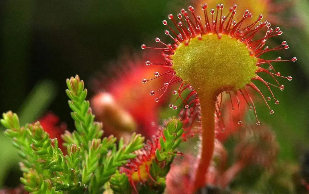 它的叶缘腺毛顶端膨大,黏糊糊的“露珠”晶莹剔透,呈现出鲜艳的色彩,上面的腺体分泌着吸引昆虫的蜜汁与黏液的混合物,藏着非常凶悍消化酶。消化酶可是茅膏菜吃虫的秘密武器!它的叶面密被分泌黏液的腺毛,当昆虫停落在叶面时,即被黏液粘住,而腺毛又极敏感,有物触及,便会向内和向下运动,将昆虫紧压于叶面。简直一半是天使,一半是恶魔。植物本身有叶绿素,可以进行光合作用,但根系不发达,因此,靠捕食昆虫弥补其氮素养分的不足。