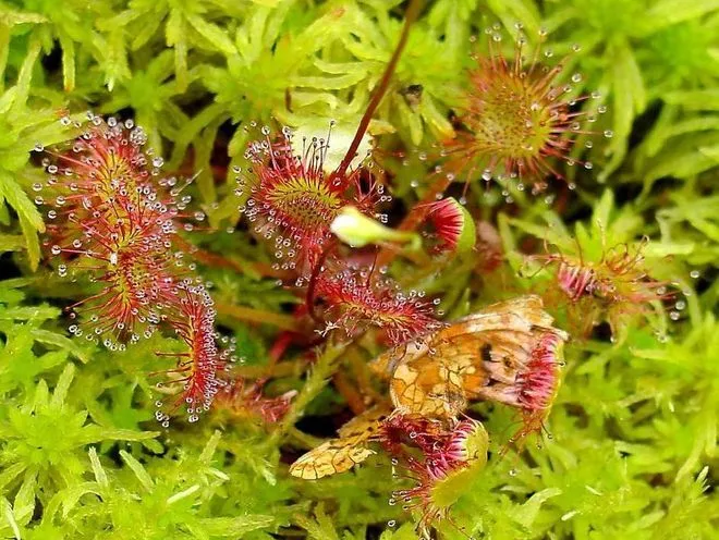 我与它对视整整三十分钟。在这期间,我目睹了苍蝇、蛾类、蜻蜓等众多昆虫,它们一个接一个地落入了圆叶茅膏菜精心设计的红色陷阱中,无法逃脱。这些昆虫,对于圆叶茅膏菜来说,是它“荤食”菜单上的美味佳肴。之前,我听说过“食人树”,而亲眼见到以昆虫为食的草本植物,还是第一次。实际上,它名字中的“菜”字,并不是指日常所见的普通蔬菜,而是一种非常特殊的“菜”。这种“菜”并不“素”,而是以昆虫为食,它吃“荤菜”。