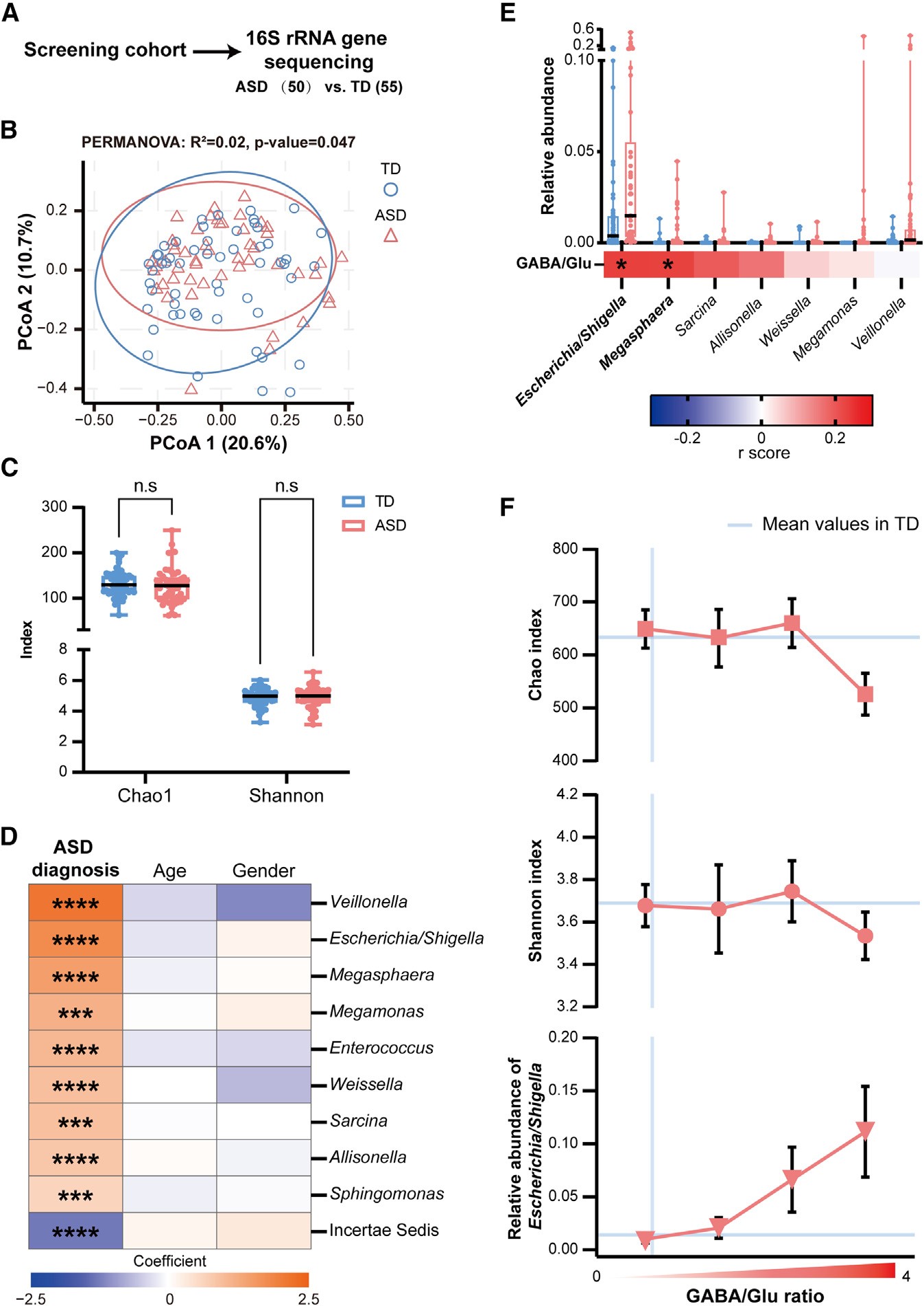 这种代谢异常并非孤立现象。研究团队通过宏基因组分析发现,在自闭症儿童肠道中,GABA/Glu 比值的升高伴随着菌群结构的失衡——尤其是 Escherichia 属的显著富集。它们携带着谷氨酸脱羧酶(GAD)相关基因,但缺乏 GABA 转运系统,意味着它们能高效“吞噬”谷氨酸,却几乎不释放 GABA,从而打破整个生态的抑制‑兴奋平衡。