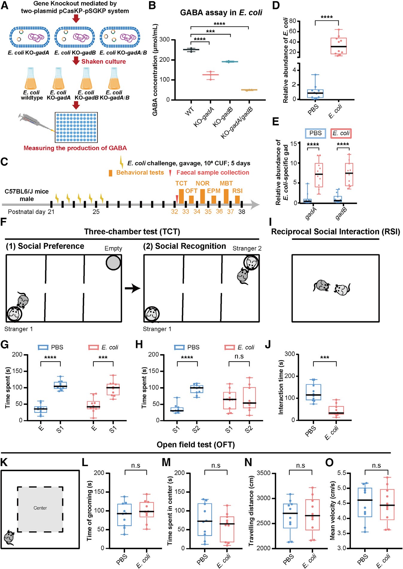 图3|在肠道中增加 E. coli 挑战,会导致小鼠出现社交障碍。