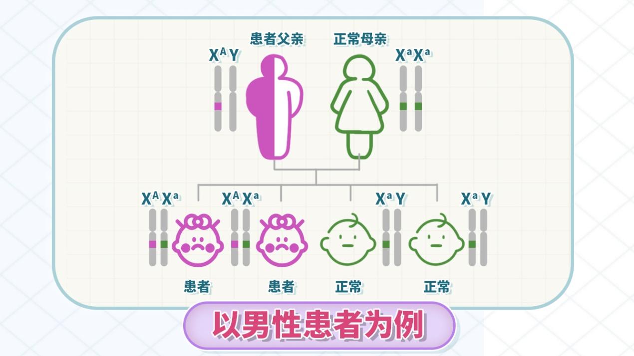 X连锁遗传(性连锁遗传)最常见,约占80%-85%,致病基因位于X染色体上。男性患者症状重,因只有一条X染色体,基因突变后无正常基因替代;女性患者症状轻,因有两条X染色体,一条异常一条正常。女性患者的子女有50%概率遗传(50%儿子患病,症状重;50%女儿患病,症状轻)。男性患者传女不传男(女儿100%为患者,症状轻;儿子不遗传)。