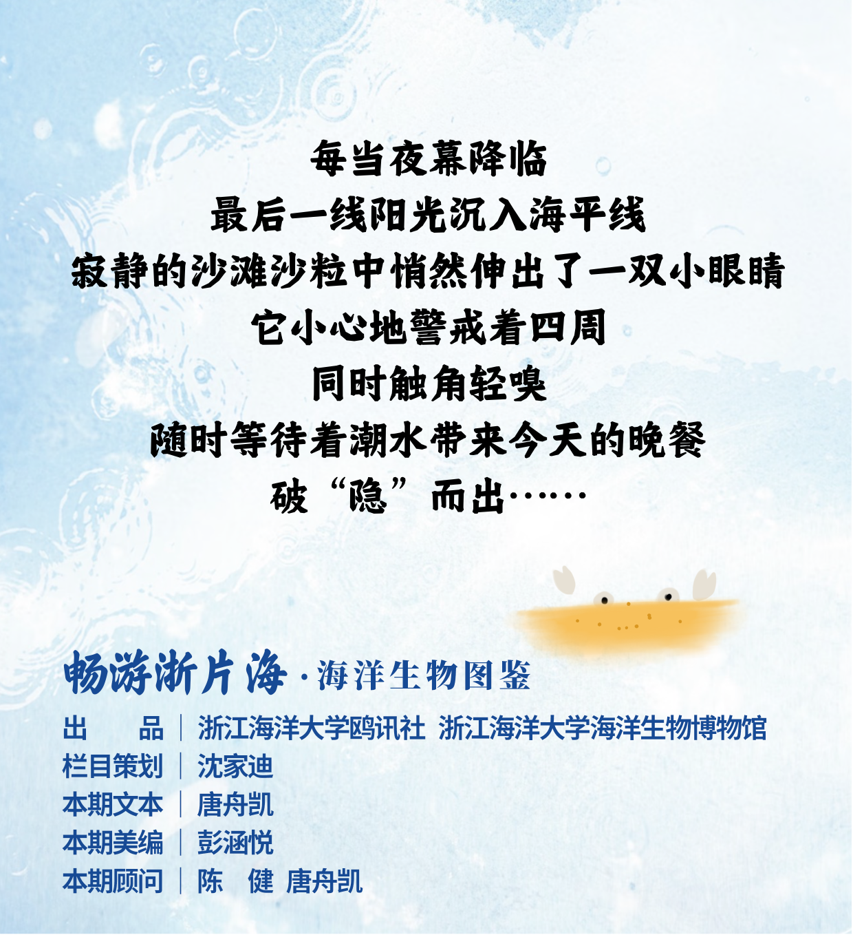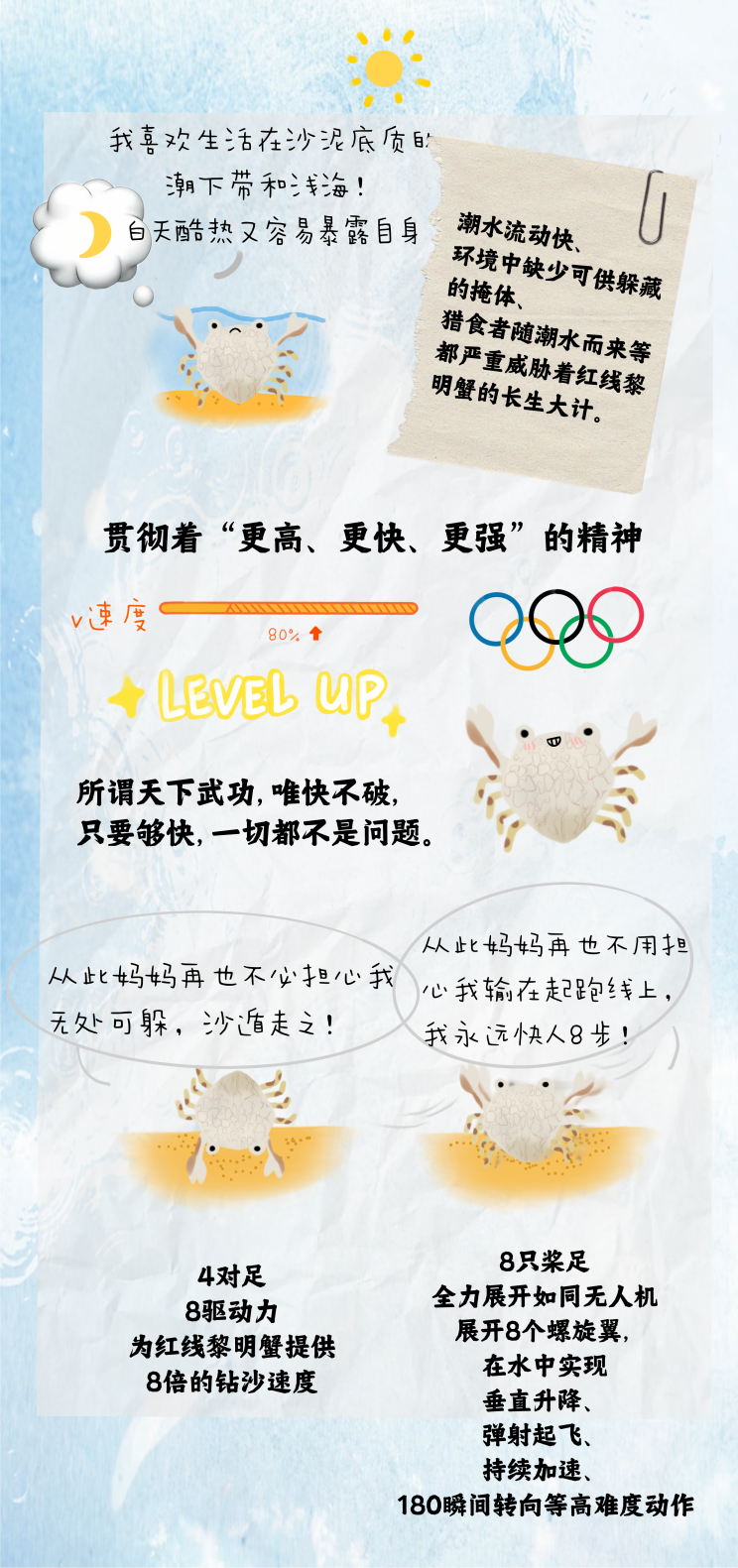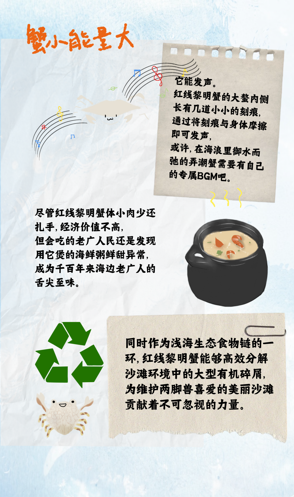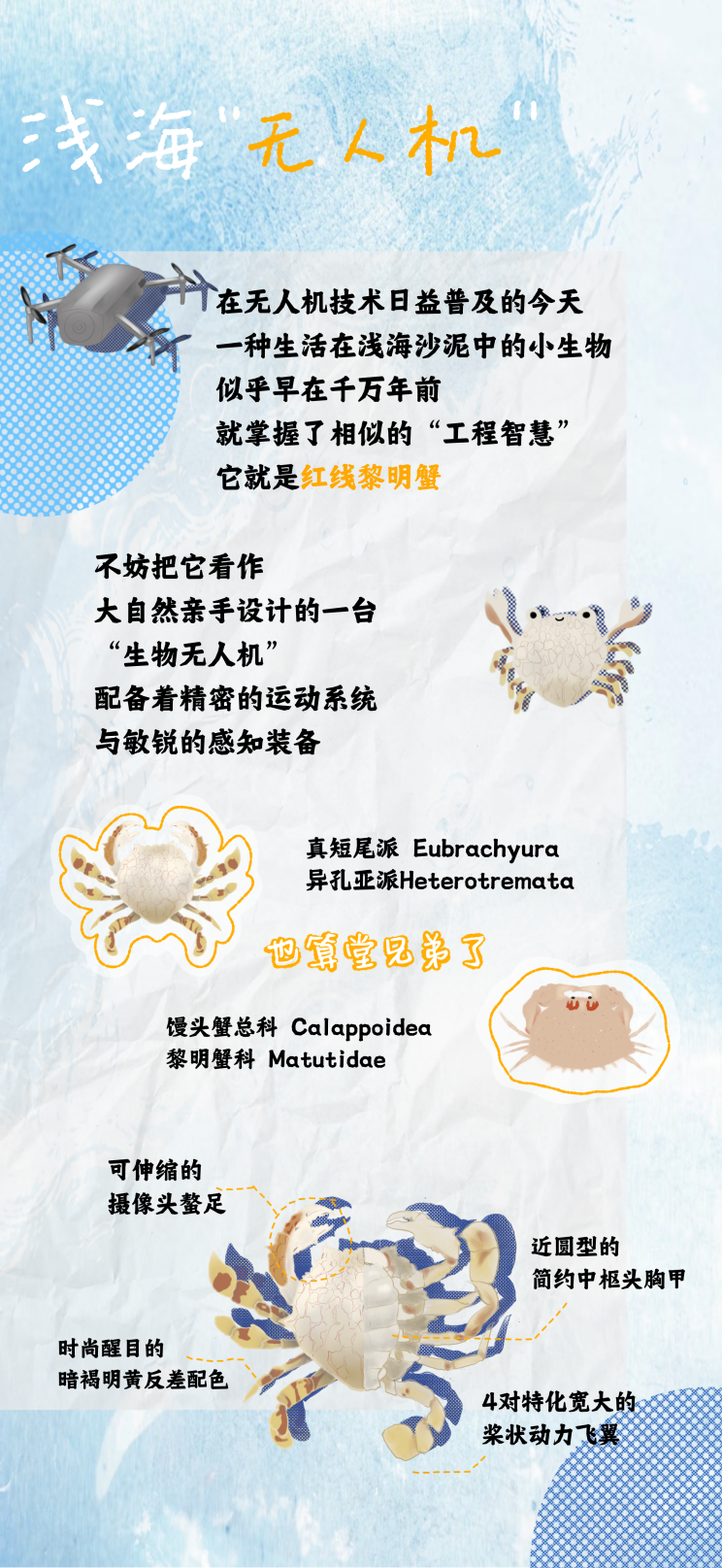图文简介: 在无人机技术日益普及的今天,一种生活在浅海沙泥中的小生物似乎早在千万年前就掌握了相似的“工程智慧”,它就是红线黎明蟹。它是海潮间的“铠甲勇士”、沙滩上的“无人机”,你知道它如何在其间“游龙”吗?