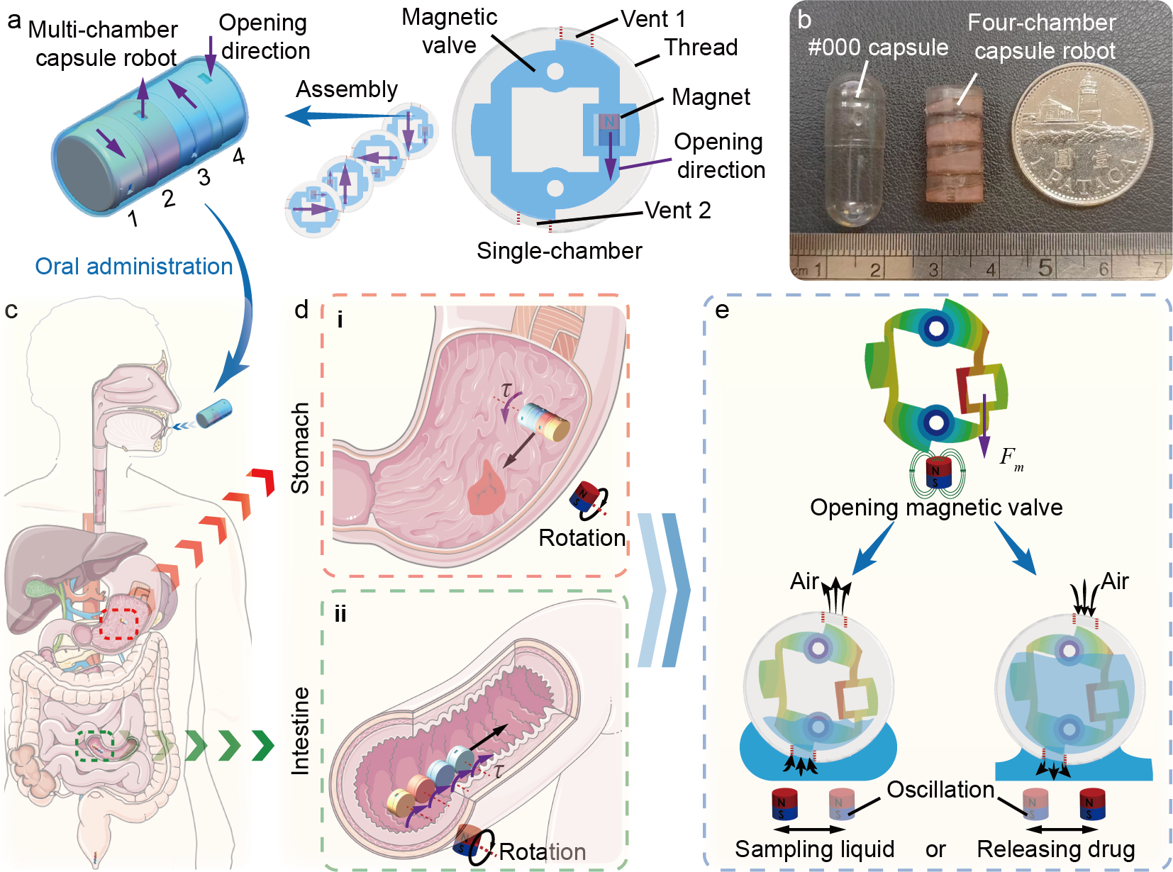 多腔室磁控胶囊机器人的结构与工作流程示意图。(a)带有四个不同开启方向单腔胶囊的多腔胶囊机器人示意图。(b)多腔胶囊机器人原型机。(c)胶囊机器人在消化道中导航示意图。(d)胶囊机器人在(i)胃部和(ii)肠道中滚动导航示意图。 (e)胶囊机器人通过打开磁阀来采集液体并释放药物示意图。